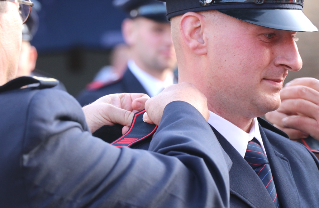 Die Aufgaben wurden von den Prüflingen alle gemeistert. Aus diesem Grundlehrgang kommt der Großteil übrigens aus der Region oder sogar direkt aus Solingen. „Nur ein Kamerad kommt von etwas weiter aus Bielefeld. Wir hoffen, dass wir ihn hierbehalten können“, sagte Polnik. Gemeinsam mit Dezernent Jan Welzel und Feuerwehrchef Dr. Ottmar Müller überreichte Oberbürgermeister Tim Kurzbach den neuen Berufsfeuerwehrmännern ihre Ernennungskunden sowie die brandneuen Schulterklappen.