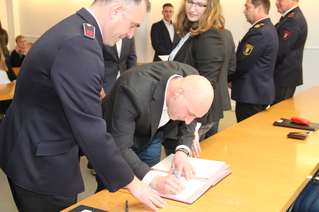 SOLINGEN (bgl) – Die Solinger Berufsfeuerwehr bildet weiter aus. Am Donnerstagvormittag konnte Ordnungsdezernent Jan Welzel im Rathaus insgesamt 16 jungen Männer den Eid abnehmen und diese mit Wirkung zum 1. April zu Beamten ernennen. Darunter auch ein Brandmeisteranwärter der Berufsfeuerwehr Oberhausen sowie ein Brandoberinspektoranwärter, der nach absolvierter Ausbildung im Führungsdienst tätig sein wird.