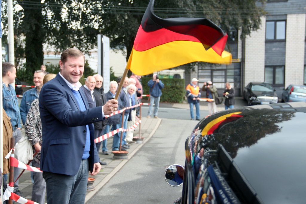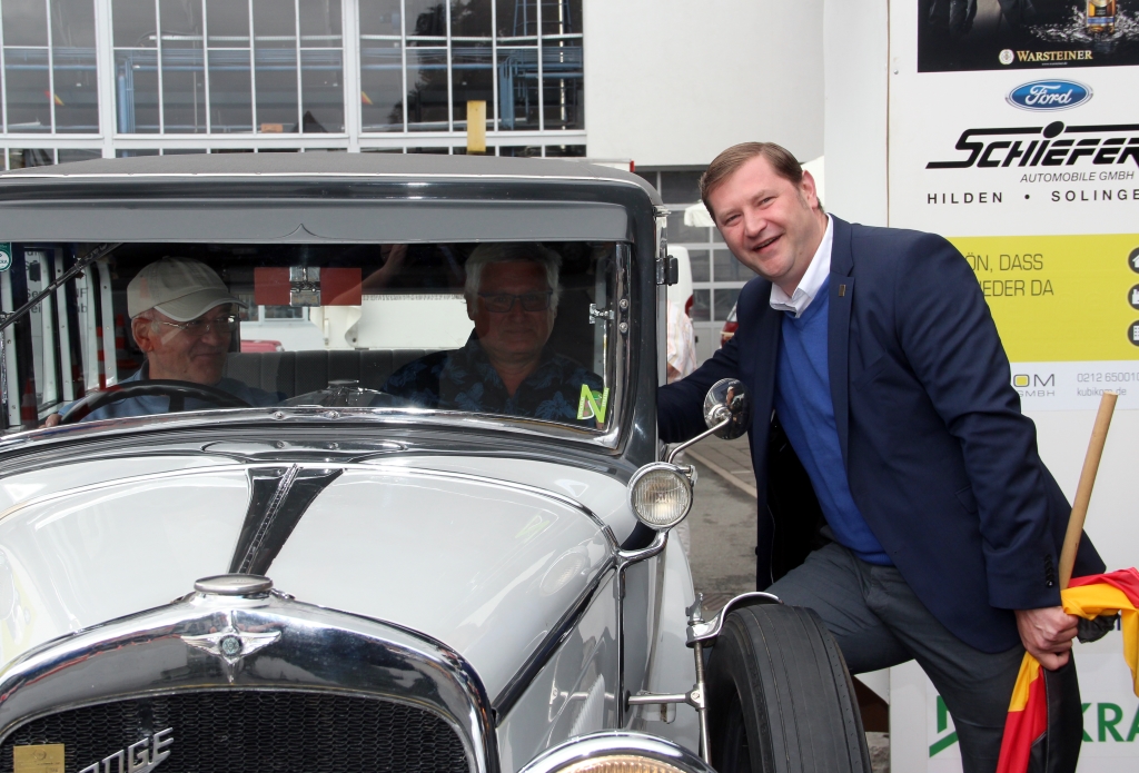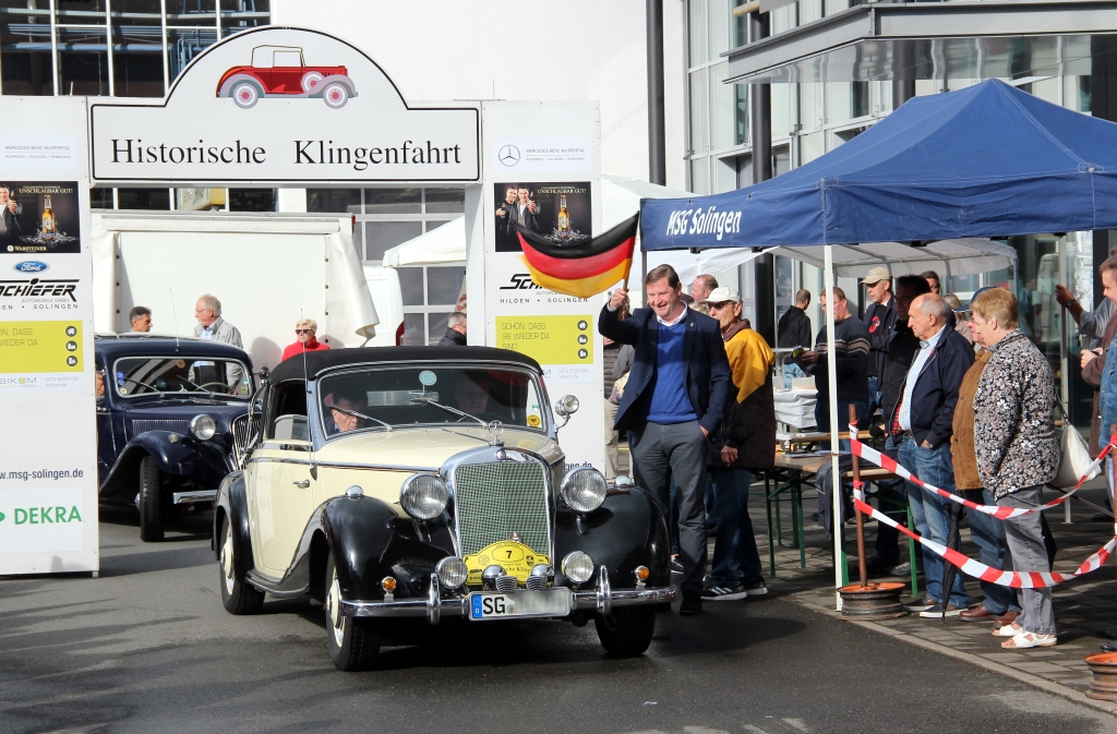 SOLINGEN (bgl) – Ganz geduldig reihten sich am Samstagmorgen auf dem Gelände der Mercedes-Benz-Niederlassung an der Schlagbaumer Straße die Fahrzeuge in einer Schlange ein. Am Startpunkt der 22. Historischen Klingenfahrt wartete Oberbürgermeister Tim Kurzbach, bewaffnet mit einem Deutschland-Fähnchen. Elegant die Flagge schwenkend schickte er die ersten Teilnehmer der Fahrt auf die rund 135 Kilometer lange Reise.