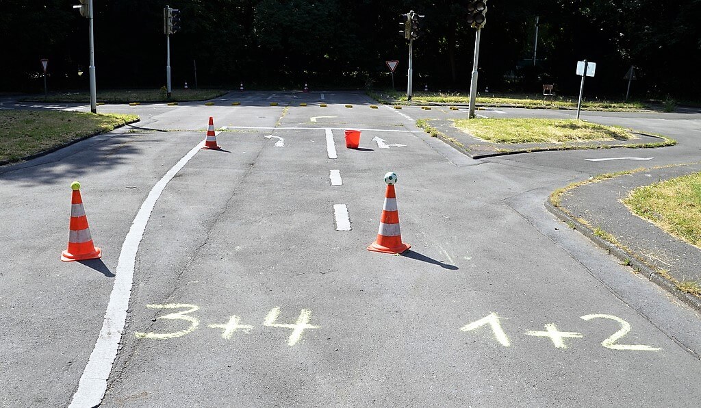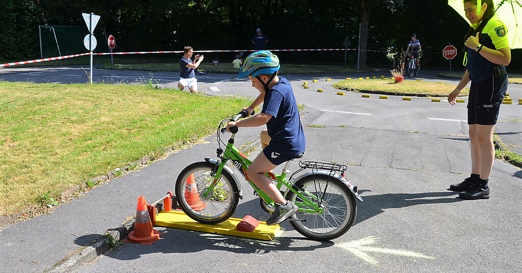 Sieben Stationen musste man beim Parcours durchlaufen. Los ging es direkt mit der Fahrt über ein Spurbrett. „Ihr sollt hier die Spur halten, das heißt, auf dem Brett bleiben. Und vor allem nicht den Fuß auf den Boden setzen“, erläuterte der Verkehrsexperte. Bei dieser Übung war der Schwierigkeitsgrad auf das Alter abgestimmt worden. So hatten die Klassen Eins und Zwei etwas breitere Bretter als die Klassen Drei und Vier. Nach einer kleinen Slalomfahrt mit engen Kurven ging es in Form einer Acht um Pylonen herum, bevor die Radler sich in den Kreisverkehr wagten.