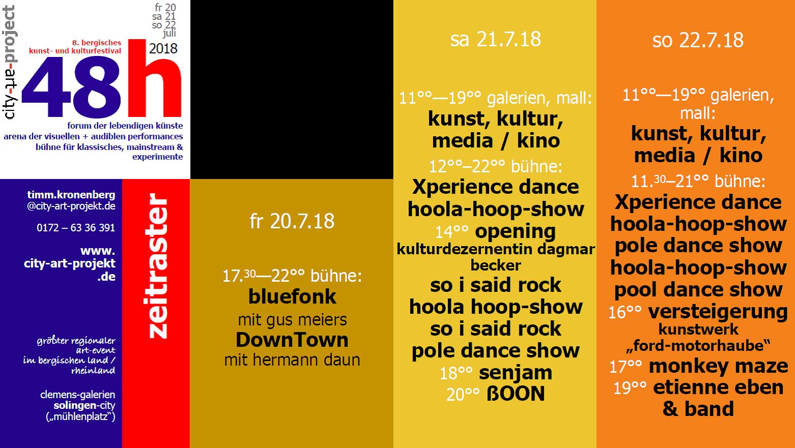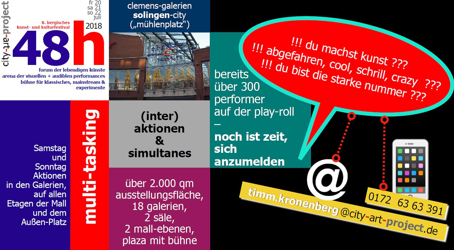 „Mittlerweile kommen viele Künstler aus dem Umland, aus Wuppertal, Köln und Düsseldorf, um ihre Arbeiten hier zu zeigen“, sagt Schorsch Wenke und fügt hinzu: „Man hat wahrgenommen, dass in Solingen künstlerisch eine Menge los ist.“ Bei diesem Event geht es weniger um reine Kunst-Ausstellungen sondern vielmehr um live Aktiv-Kunst, Projektkunst (wie z. B. WORLD TRASH SOCIETY), Installationen, Eventschmiede, Bildhauerei, Performances, Bauchtanz, Multimedia, Theater & live Musik. 48 Stunden lang wird es kreuz und quer in den Clemens-Galerien – außen wie innen, auf der Bühne und im Kino – die unterschiedlichsten Aktionen und Ausstellungen geben. Freunde der Musik dürfen sich auf elektronische Musik, sakrale Chormusik, Singer/Songwriter und Reggae freuen.