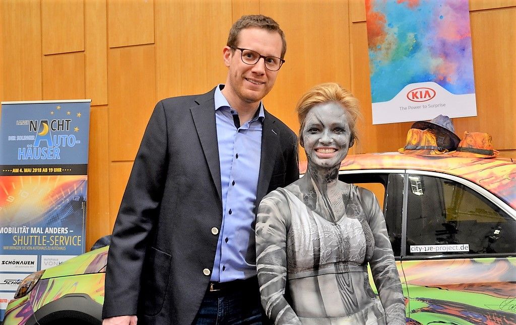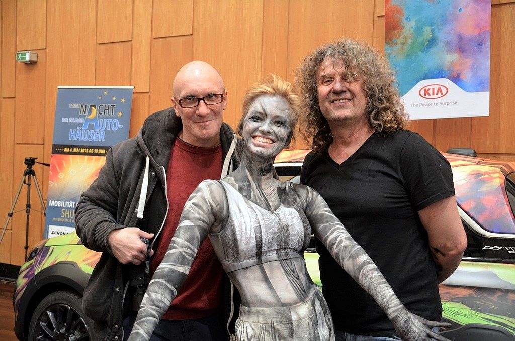 Neben den glänzenden Modellen des Autohauses Schönauen stand zugleich ein künstlerisch gestalteter Opel ADAM. Im Rahmen von Live-Painting-Aktionen kann dieser Wagen bei speziellen Events, Messen, Hochzeiten oder sonstigen Anlässen als Eye-Catcher und Ausstellungsstück genutzt werden. Voraussetzung hierfür ist eine tolle Idee für die Gestaltung. Dieses Kunstprojekt ist durch die erfolgreiche Zusammenarbeit von AH Schönauen, Timm Kronenberg vom city art project und Künstler Zoran Velinov entstanden (wir berichteten). An diesem Wochenende begeisterte Velinov mit einem gelungenen Bodypainting die Zuschauer. Painting-Modell Anna hatte ebenso ihren Spaß an der Aktion.