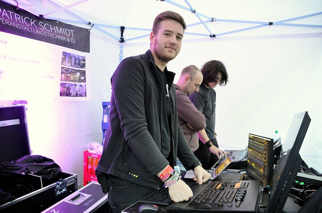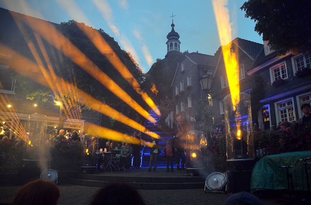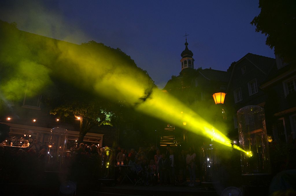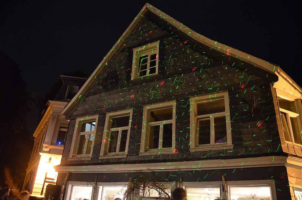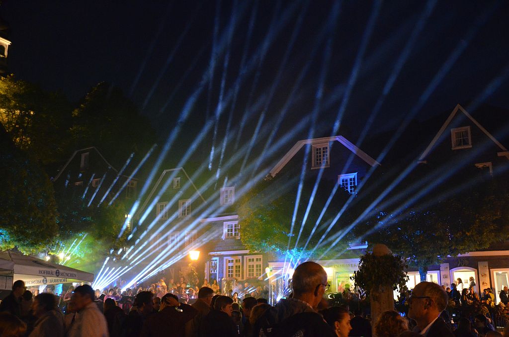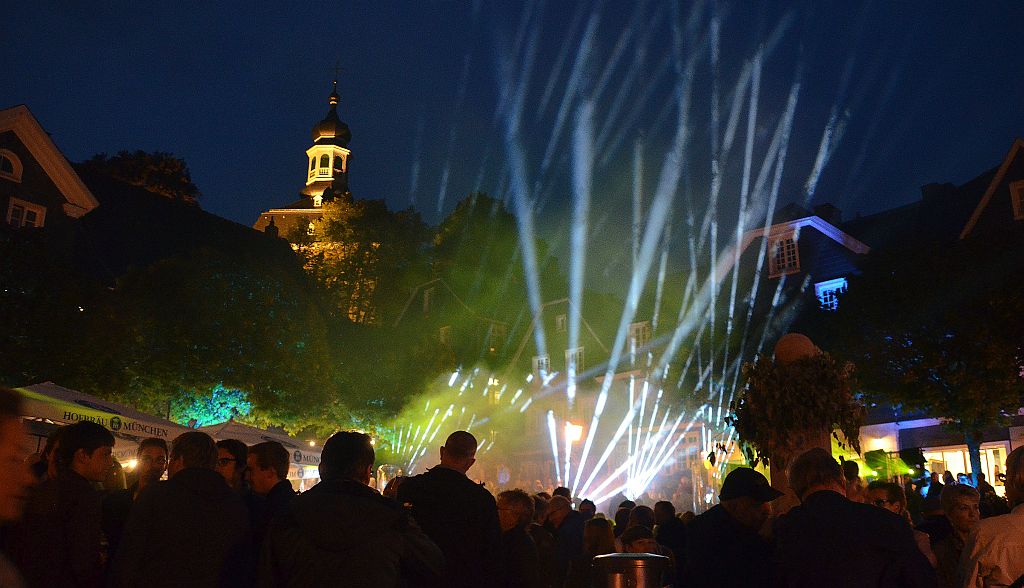 Gleich zu Beginn waren die Veranstaltungen gut besucht. Mit zunehmender Dunkelheit füllten sich die Straßen, so dass die einzigartigen Lichtinstallationen zur Geltung kommen konnten. Künstler und Galerist Dirk Balke kündigte im speziellen Outfit die Lichtschau an. Diese Schau, drei Mal zu sehen, war das Highlight des Abends. Max Michalek, Lichtgestaltung, und Patrick Schmidt, Veranstaltungstechnik, hatten Stunden um Stunden Programmier- und Aufbauarbeit investiert, um die musikalischen Klänge in Lichteffekte umzusetzen. So erstrahlte nicht nur der gesamte Marktplatz. Auch die Treppe hinauf zur Klosterkirche wurde illuminiert.