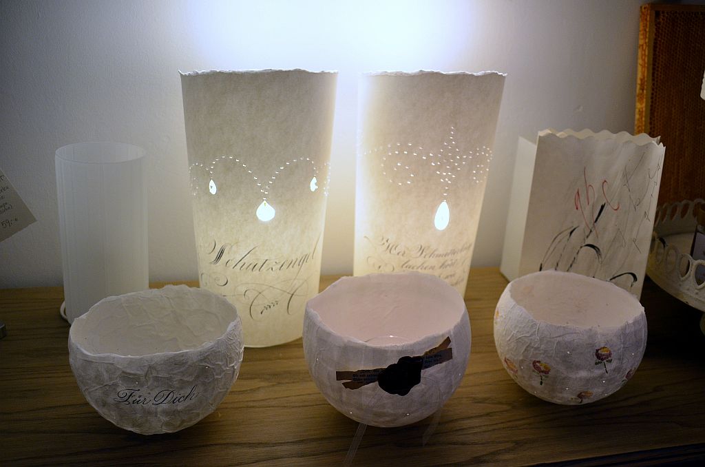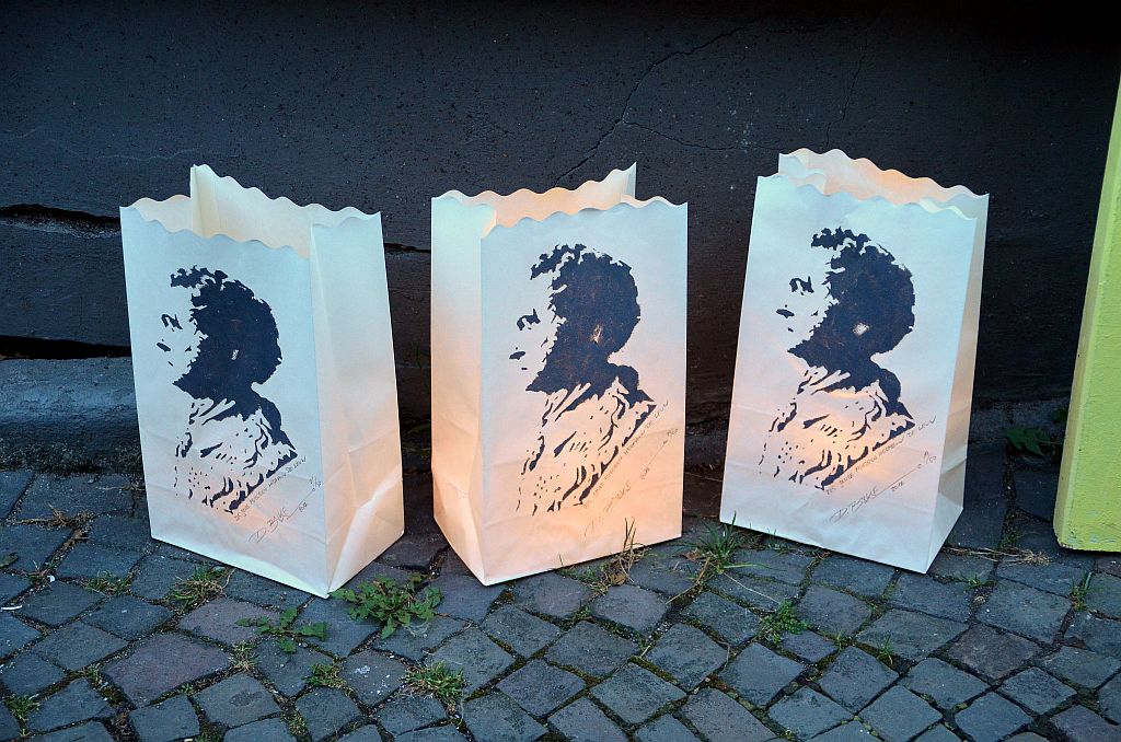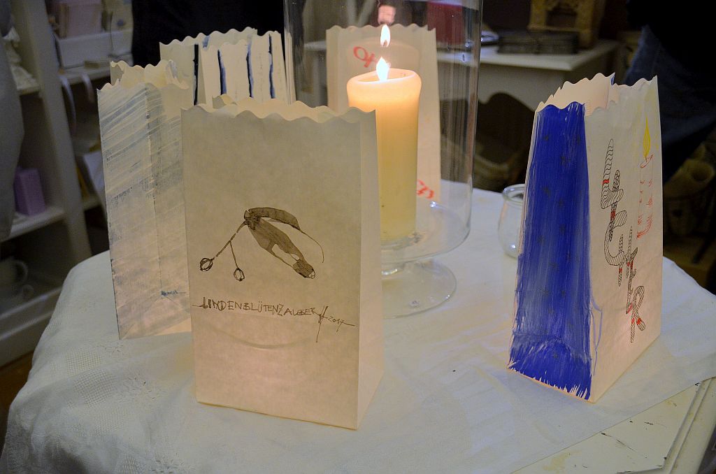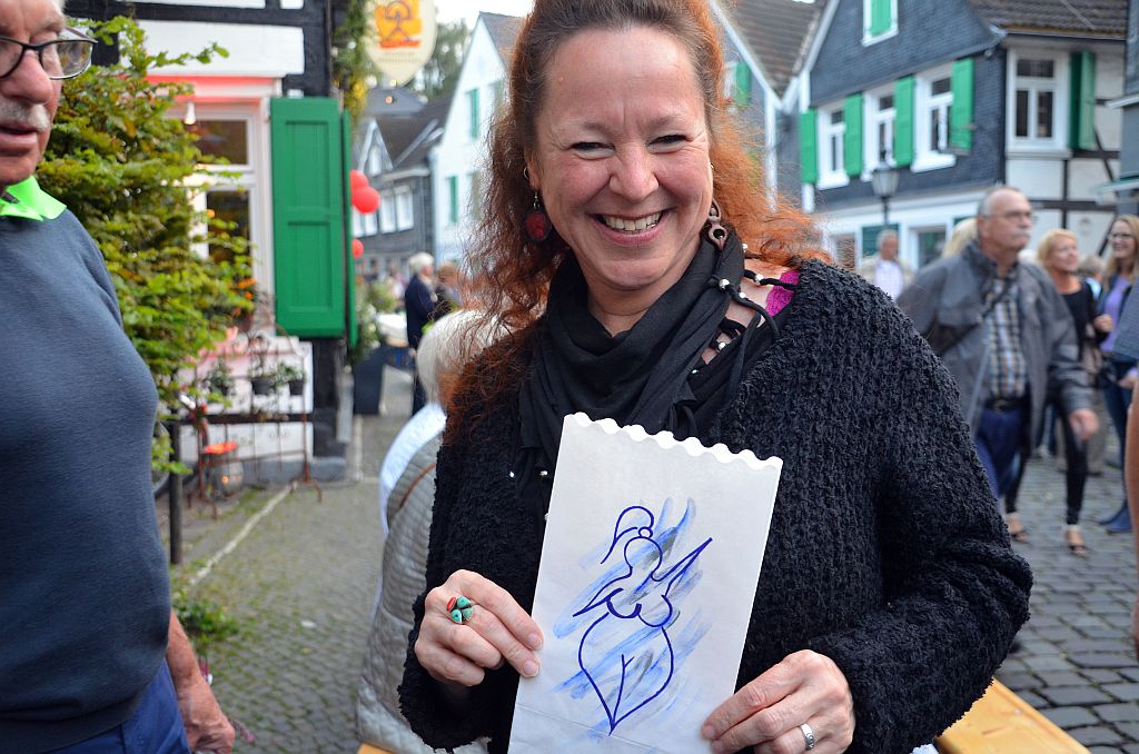 Ein ganz großer Renner waren die gestalteten Lichtertüten. Die Idee dazu hatte Cornelia Kreitzberg von JACK SONO Vintage schon beim ersten Lichterfest. In diesem Jahr gestalteten die Gräfrather Künstler erstmals die Tüten selbst. Neben den fröhlich-bunten Sommerbildern von Heike Buschkotte-Leichsenring gab es Liebesgöttinnen von Nici Ventker. Dirk Balkes Tüten zierte ein Bild von Friedrich Hermann de Leuw. Gräfrather Motive und Sprüche von Luther waren ebenfalls dabei. Die Tüten, handsigniert, fanden guten Anklang und wurden gerne mitgenommen.