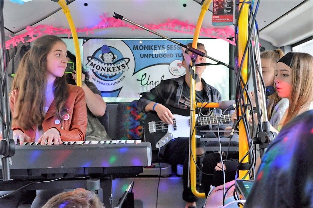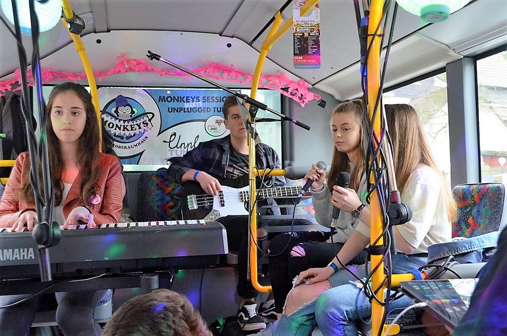 „Viel Spaß“ wünschte die Gruppe Flawless bei ihrer musikalischen Runde im Bus 10. Die Jugendlichen im Alter von 14 – 15 Jahren besuchen die gleiche Klasse der FALS. Vor zwei Jahren haben sie sich im Rahmen des FALS-Bandprojektes gegründet. Bei der KulturNacht präsentierten sie Coversongs, aber auch ein eigenes Werk. Es gab viel zu lachen und später auch den wohlverdienten Applaus.