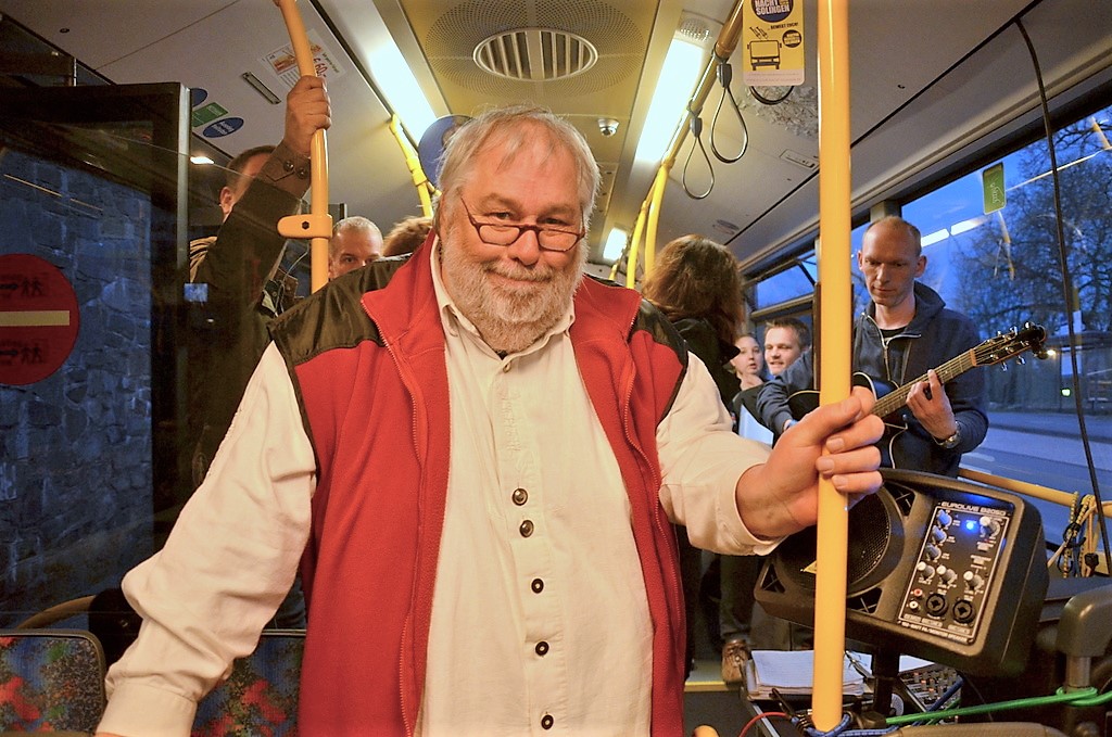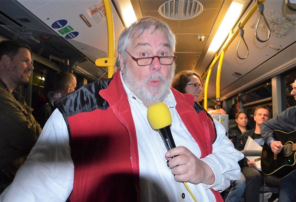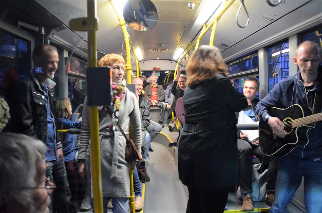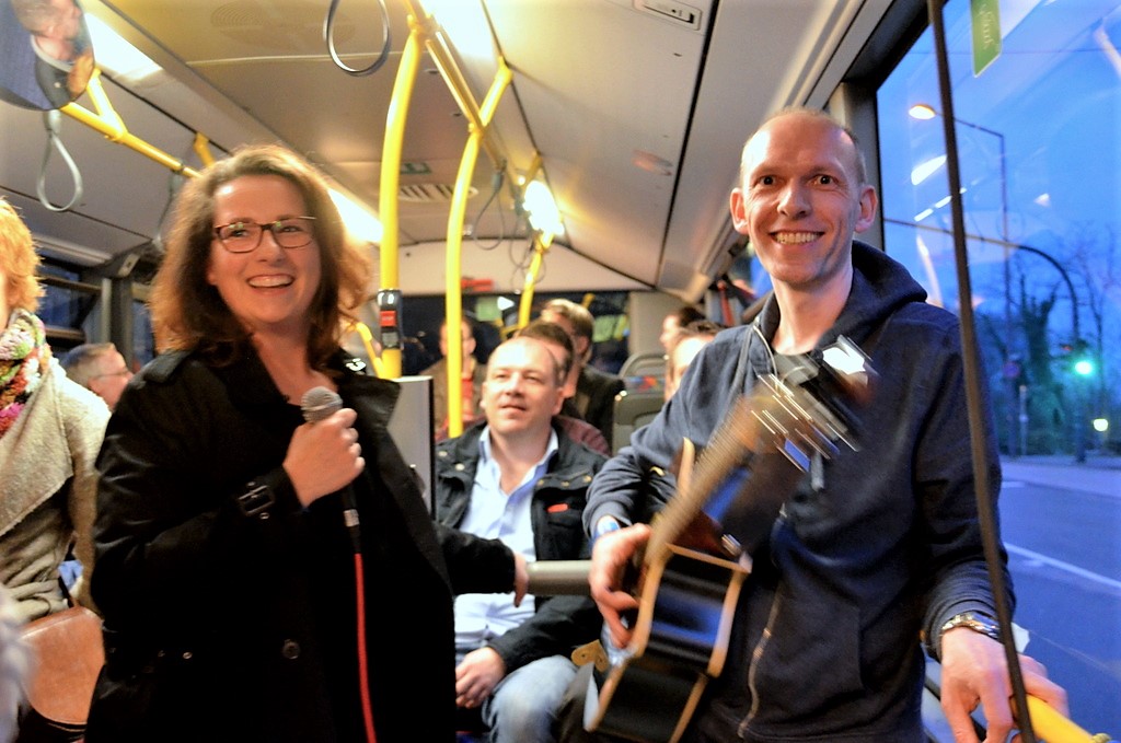 In der Linie 11, dem BurgerBrezelBummelBus sorgte neben anderen Musikern das Duo Joe & Jaz für tolle Stimmung. Die Solinger Sängerin Jasmin Ottow und der Kölner Gitarrist Johannes Bongartz unterhielten mit Songs wie „Image may contain“ und „people, people smiling“. Die Moderation hatte Hans-Georg „Schorsch“ Wenke übernommen. Er führte mit humorvollen Worten durch die musikalische Fahrt. Auf seine geplanten Bergischen Anekdötchen verzichtete der Entertainer zugunsten der technischen Betreuung der Musiker. „Wir bauen bei jeder Tour die Technik um, machen Soundcheck. Da bleibt keine Zeit für die Burger Brezel“, meinte Wenke, war aber mit seiner Moderatorenrolle durchaus zufrieden. Sein Lob ging an den Fahrer, der es bis dahin noch nicht geschafft hatte, „uns in den Graben zu fahren“.