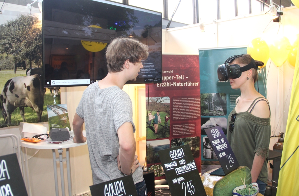 An gleich mehreren Ständen konnte eine VR-Brille ausprobiert werden. Stets belagert war der Flugsimulator des Solinger Unternehmens Aerotask. Die Stadt Solingen zeigte ihre Angebote an einem großen Stand. Dort wurden die Themen Marketing und Tourismus besonders hervorgehoben. Und es gab Käse aus Solingens Partnerstadt Gouda zu verkosten – und zu kaufen.