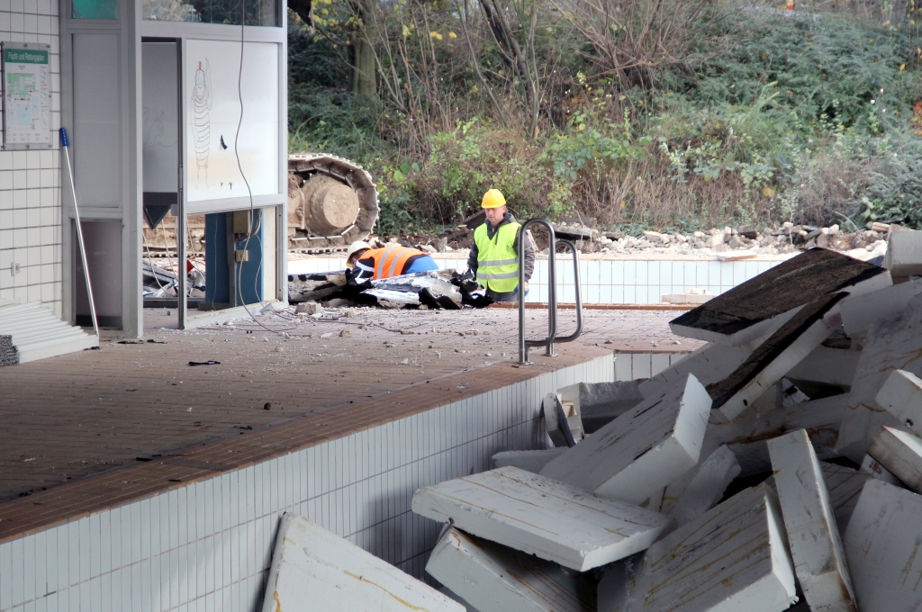 SOLINGEN (bgl) – Wo ganze Generationen Schwimmen gelernt, wo begeisterte Sportler jahrzehntelang Bahn um Bahn gezogen und wo es sich die ganz Kleinen im Baby-Becken gemütlich gemacht haben, wüten seit Montag die Abrissbagger. Das Hallenbad Vogelsang wird abgerissen.  Bereits am 20. Oktober begannen die Demonagearbeiten im ehemaligen Hallenbad. An alter Stelle soll ein modernes neues Hallenbad entstehen. Vorher aber muss der Altbau weg. „So sieht ein Hallenbad aus, wenn es entkernt ist“. Mit diesen Worten begrüßte Kirsten Olsen-Buchkremer von der Solinger Bädergesellschaft am Mittwoch die Presse, die ins im Abriss befindliche Hallenbad Vogelsang eingeladen wurde.
