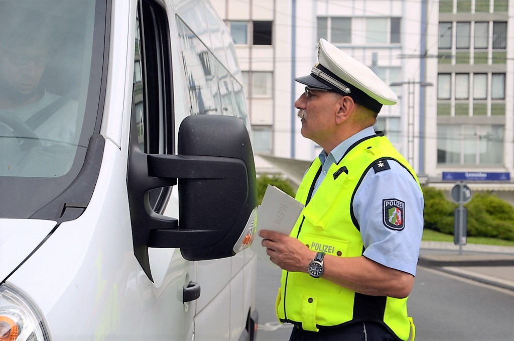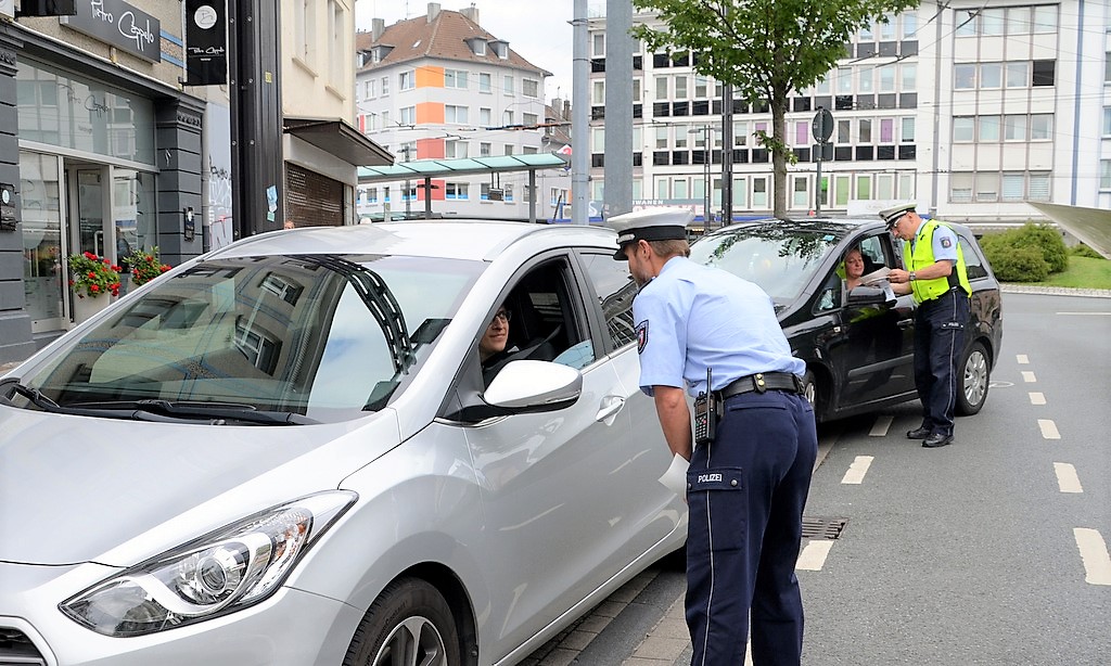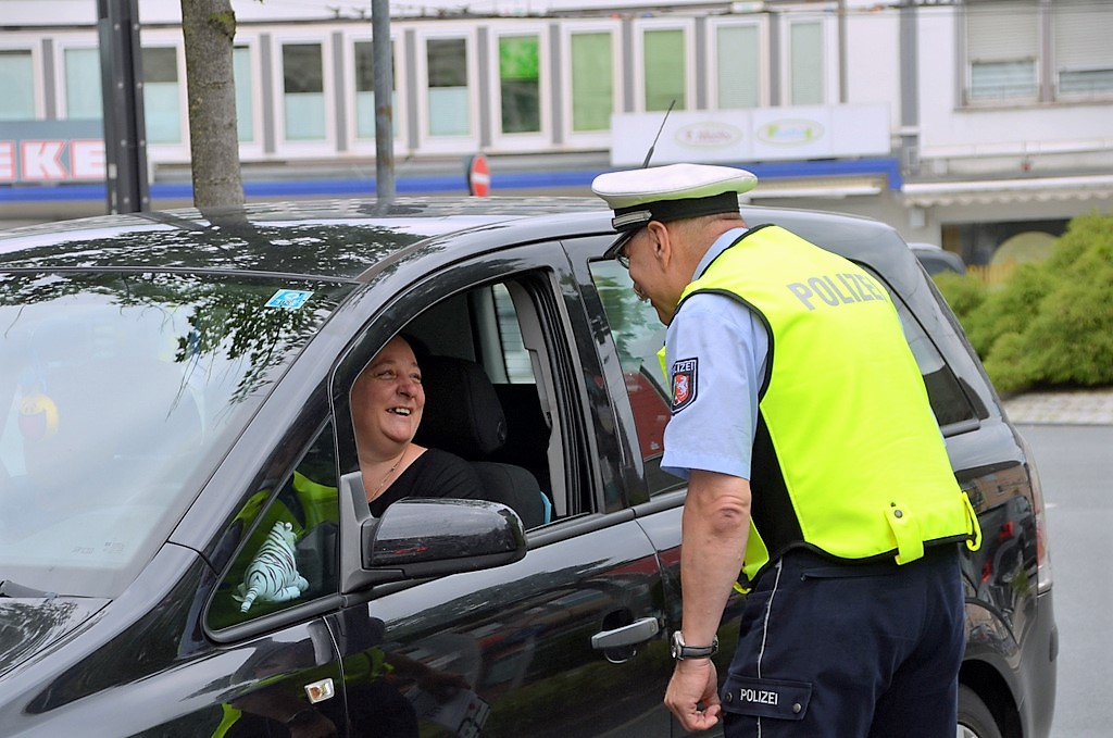 Während man vormittags am Hofgarten die Fahrer informierte und beriet, stehen die Beamten am Nachmittag an der Kölner Straße / Ecke Eiland. Der Kreisverkehr hat so seine Tücken. Der Großteil der Autofahrer fährt vorbildlich, hält nach dem Abbiegen an und lässt die Passanten die Straße überqueren. Trotzdem werden einige von ihnen heraus gewunken. „Das haben Sie wunderbar gemacht“, lobt Ulrich Schmidt eine Fahrerin. Die guckt ganz erstaunt und freut sich dann. Ja, manchmal gibt es auch ein Lob von der Polizei. Die Beamten verteilen Flyer an die Autofahrer und wer mag, bekommt einen Aufkleber für sein Fahrzeug. Der wurde von Schülern des Technischen Berufskollegs entworfen und von der Verkehrsunfallprävention finanziert.