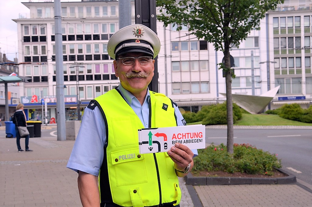 SOLINGEN (mh) – „Achtung beim Abbiegen!“ Mit dieser Vor-Ort-Aktion haben in allen drei bergischen Großstädten die Beamten der Verkehrsunfallprävention der Polizei Wuppertal wieder einen wichtigen Beitrag zur Unfallprävention geleistet. Falsches Verhalten beim Abbiegen ist eine der häufigsten Unfallursachen im bergischen Städtedreieck. Dazu Katrin Grastat, Polizeihauptkommissarin: „Im letzten Jahr sind allein in Solingen 29 Fußgänger bei einem Abbiegevorgang verletzt worden. In 28 Fällen lag die Schuld beim Autofahrer.“ Sie ist heute gemeinsam mit ihrem Kollegen Ulrich Schmidt unterwegs. Polizeioberkommissar Christian Boehnke leistet tatkräftige Unterstützung.