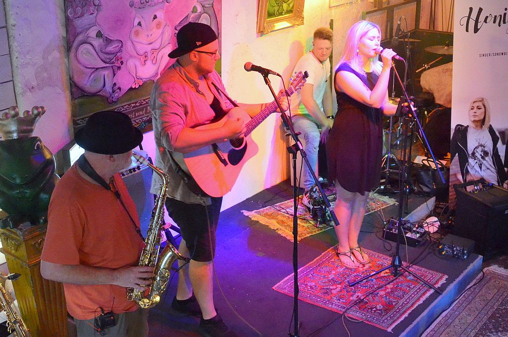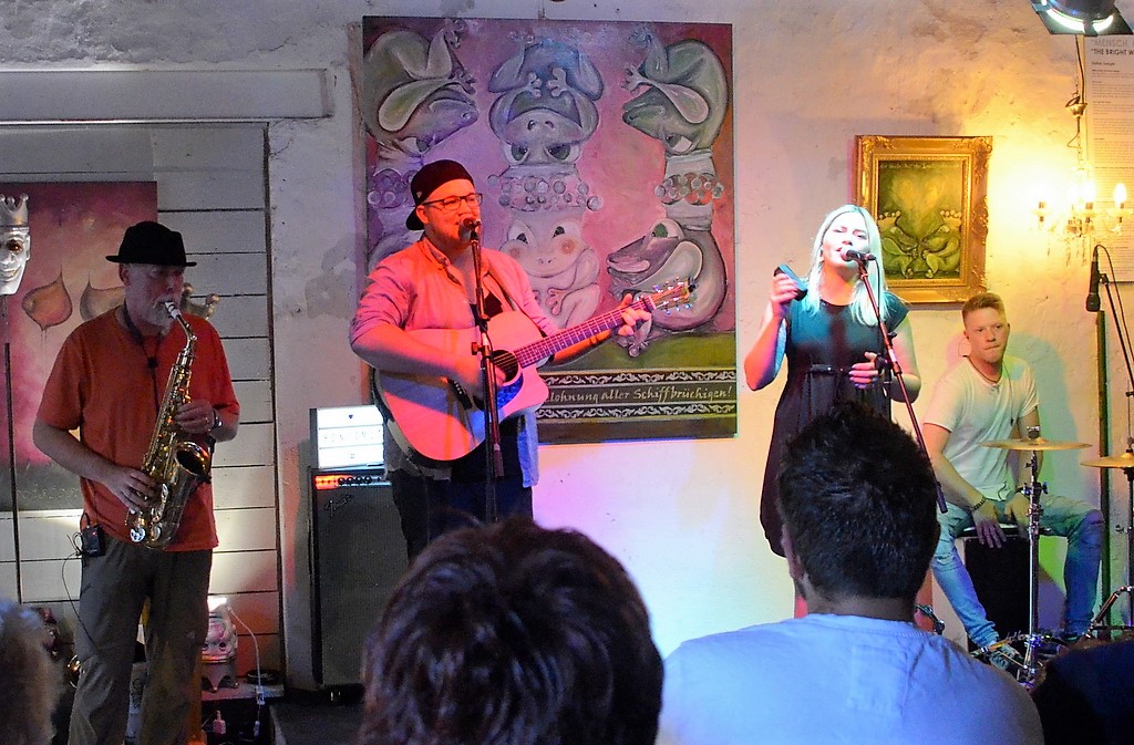 Auch an diesem Abend im Stellwerk gelingt es den Vieren mühelos, das Publikum zu begeistern. „Wir spielen einen Mix aus eigenen und gecoverten Stücken. Es sind unsere Lieblingslieder, die wir auf unsere Art interpretiert haben. Lasst euch überraschen und genießt die Musik“, so die kleine persönliche Ansprache der Sängerin ans Publikum. Und die Zuhörer genießen – mal den Coversong „Bei meiner Seele“ von Xavier Naidoo, mal die Eigenkomposition „Küss mich“, in der es um das Verliebtsein geht, oder den Trennungssong „Gefühle kommen und gehen“. Kraftvolle Stimmen, inhaltlich starke Texte und gängige Melodien fügen sich zu einer perfekten musikalischen Einheit zusammen.