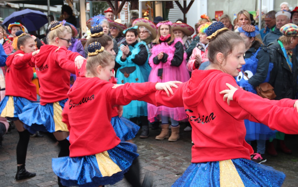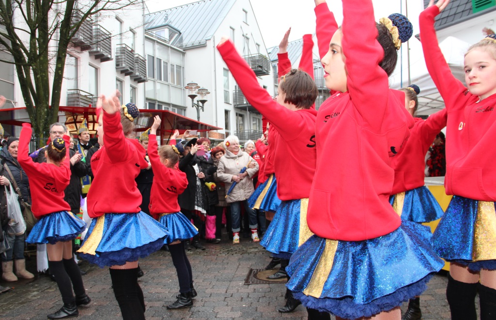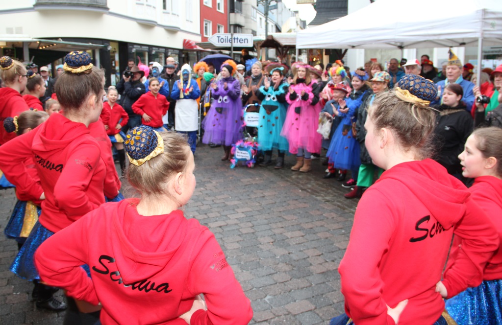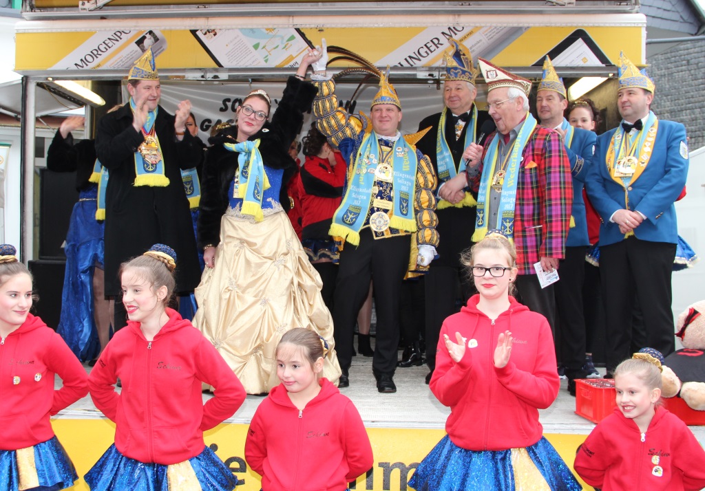 Die Tanzformation Schiwa zeigte auf dem Platz vor der Bühne ihr kunterbuntes Programm zu schmissigen Karnevalsliedern. Und so wurden auch schon die ersten Bierchen gezischt, als Bürgermeister Ernst Lauterjung gemeinsam mit Prinz Jochen zum traditionellen Fassanstich einlud. „Es ist ganz toll, dass heute Morgen so viele Jecken gekommen sind. Das ist Karneval und so soll es auch sein. Wir hoffen, dass wir am kommenden Rosenmontag sonniges Wetter haben“, freute sich Joachim Junker, Vorsitzender des Festausschusses Solinger Karneval und Präsident der Prinzengarde Blau-Gelb Ohligs. Diese lädt heute Abend in die Festhalle zum traditionellen Altweiberball ein.