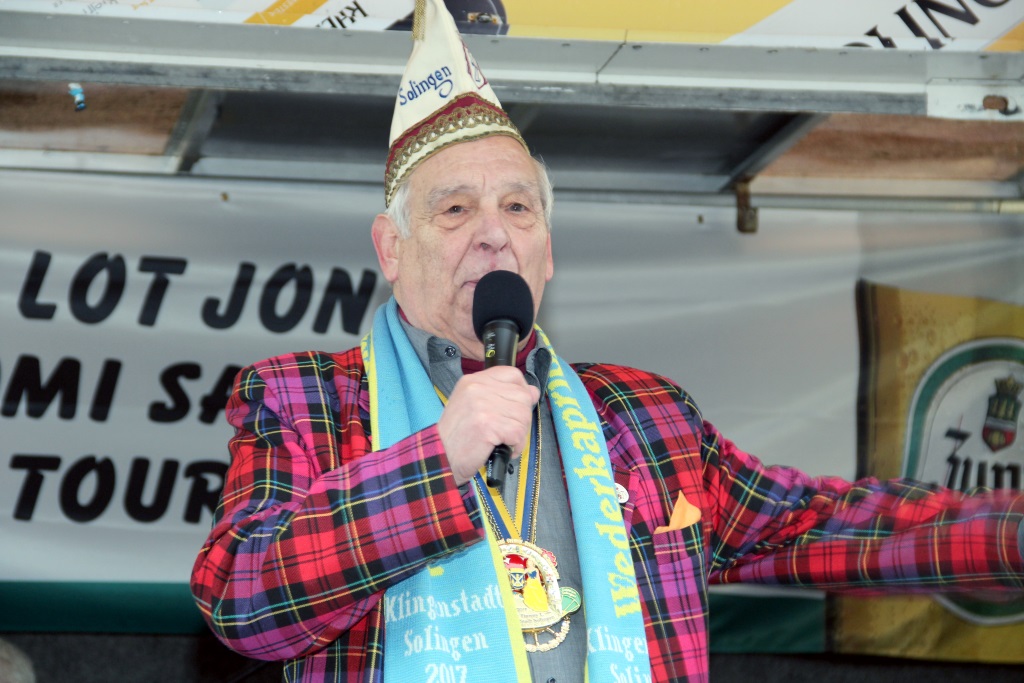 SOLINGEN (bgl) – In Solingen haben die Möhnen das Regiment übernommen! Betritt Solingens karnevalistisches Urgestein, der Gräfrather Humorist Willy Weber, die Bühne, dann bleibt kein Auge trocken. Eine wahrhafte Kanonade karnevalistischer Spitzfindigkeiten feuerte Weber, gerade erst 80 Lenze jung geworden, am Donnerstag zum Auftakt des Solinger Straßenkarnevals auf die versammelten Jecken im Walder Rundling ab.