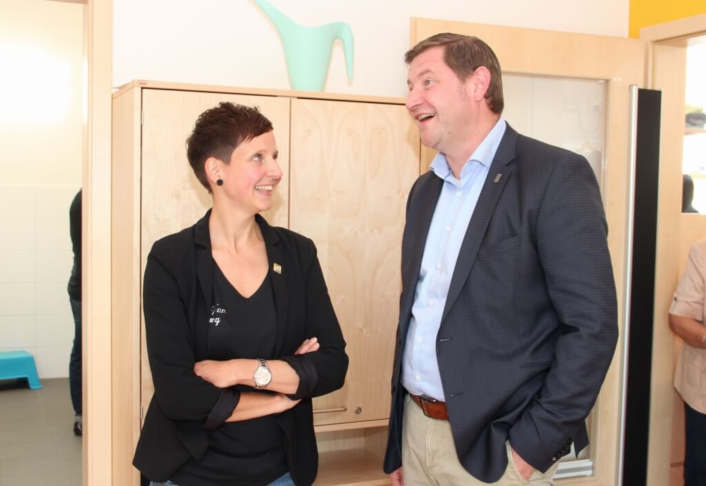 Nach der Kita-Eröffnung ist vor der Kita-Eröffnung. Oberbürgermeister Tim Kurzbach hat das rote Band durchschnitten und die Kita "Opderhüh" feierlich eingeweiht. Kita-Leiterin Sabine Claas (li.) hält das Mikro. (Foto: © Bastian Glumm)