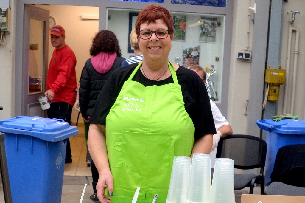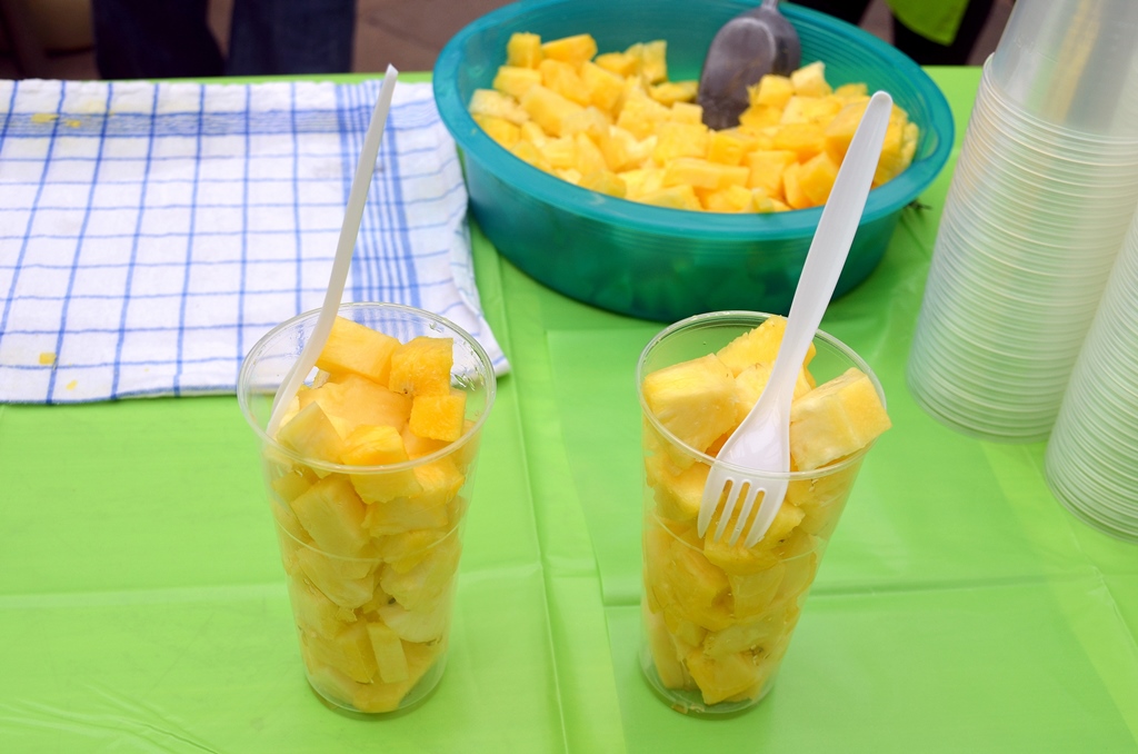 Vor dem Bromelienhaus hat Familie Juckel (Vater, Mutter und Tochter) ihren Stand aufgebaut. Hier wird schwer gearbeitet. 200 Ananas wollen geschält und kleingeschnitten werden. Die süßen Obststücke werden im Becher angeboten und können sofort verzehrt werden. „Ich weiß am Abend schon, was ich getan habe“, meint Vater Juckel. Er bedient die Schälmaschine. Dafür braucht man Kraft.