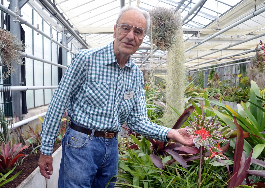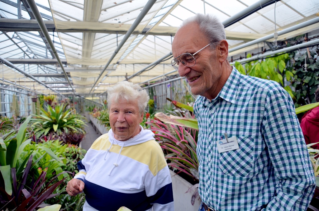Dr. Hans-Werner Hammen und seine Frau Margarete führen interessierte Gäste gerne durch das Treibhaus, beantworten Fragen und geben Tipps zu Haltung und Pflege. „Die Führungen mache ich jetzt seit 2004“, erzählt Dr. Hammen. „Eigentlich bin ich Chemiker, aber ich hatte Botanik als Nebenfach.“ Der Bromelienkenner interessiert sich auch für Kakteen. „Ich sag immer, Bromelien und Kakteen sind wunderbar für Berufstätige geeignet“, schmunzelt er. „Die Pflege ist sehr überschaubar.“