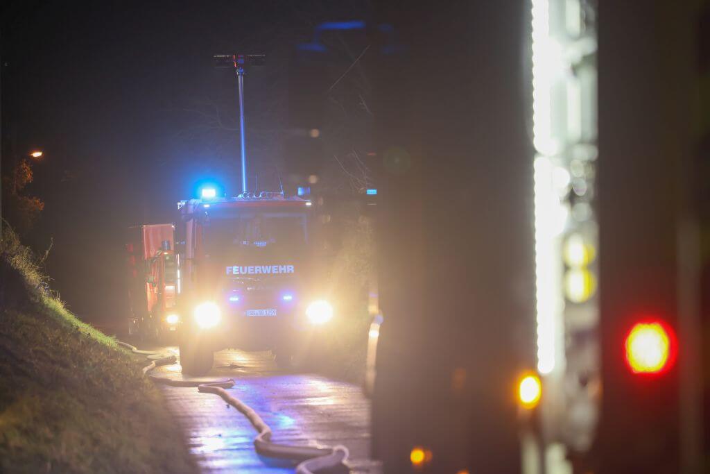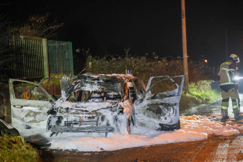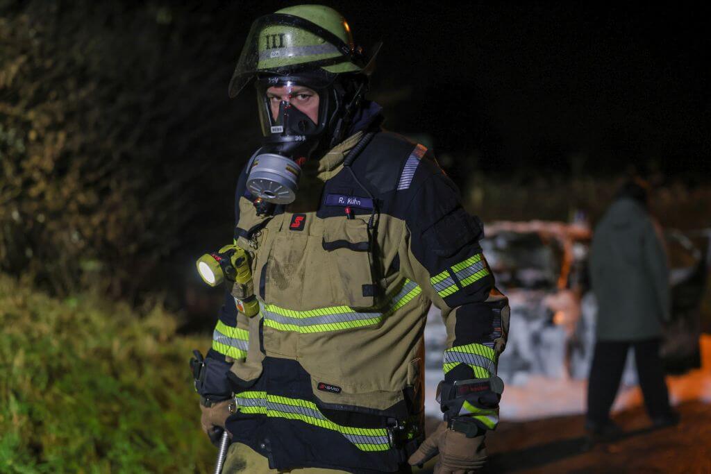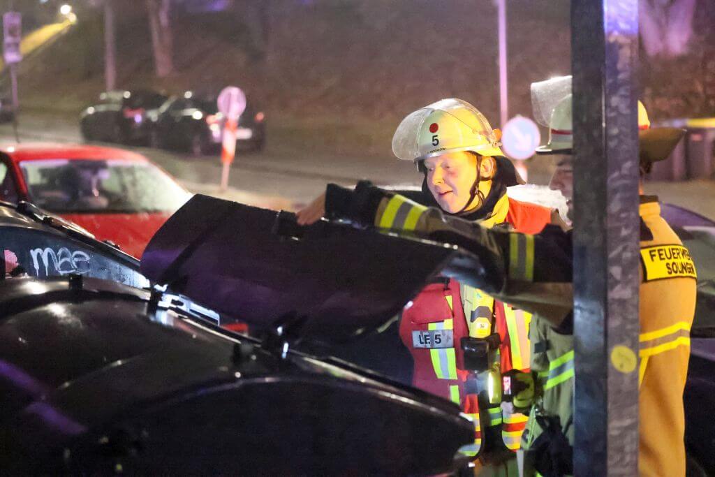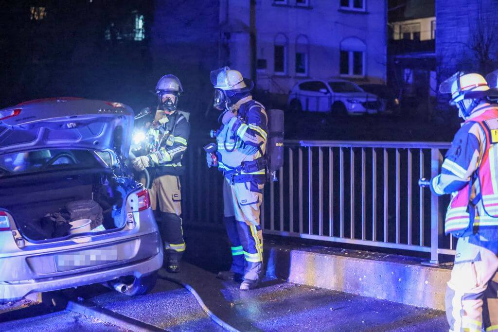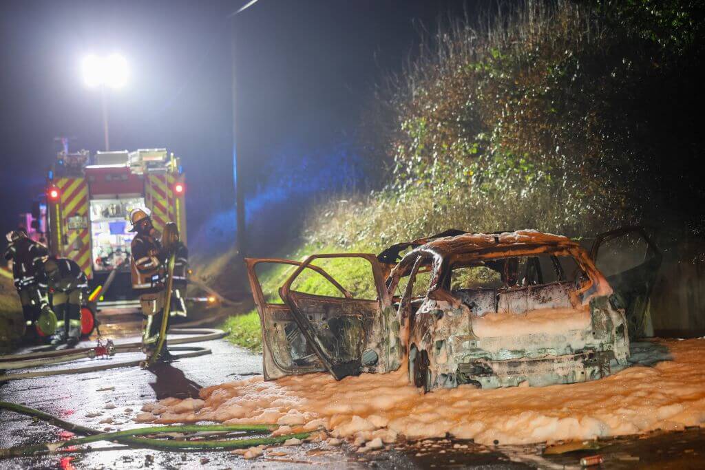 Ein weiterer größerer Einsatz ereignete sich an der Walder Straße. Kurios: Ein Paar genoss in einem E-PKW die gute Aussicht an einer abgelegenen Stelle und feuerten dort auch Feuerwerk ab. Nach bisherigen Erkenntnissen entzündeten die beiden eine Feuerwerksbatterie an der geöffneten Kofferraumklappe, die Batterie kippte jedoch um und entzündete in wenigen Momenten den kompletten PKW, der vollständig ausbrannte. Die Lösch- und Bergungsarbeiten gestalteten sich aufgrund des Elektroantriebs dort besonders zeitintensiv.