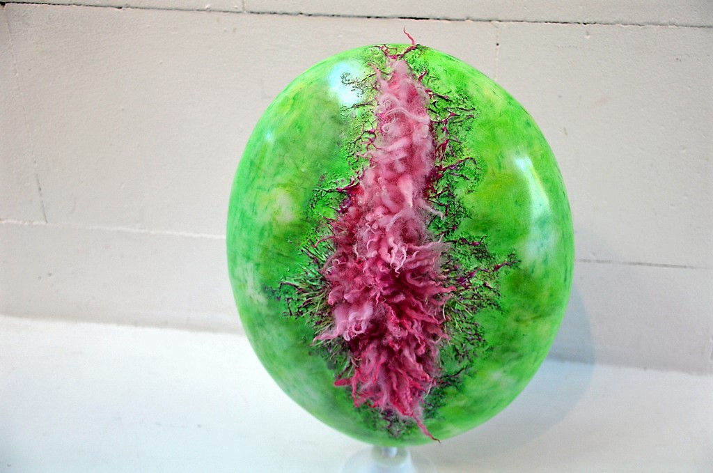 Aus 200 Meter Schrumpffolie und einer Decke ist ein 150 x 60 cm großes Gebilde entstanden, das an ein überdimensionales Gewächs erinnert. Es trägt den Titel „Sphäre 1“.