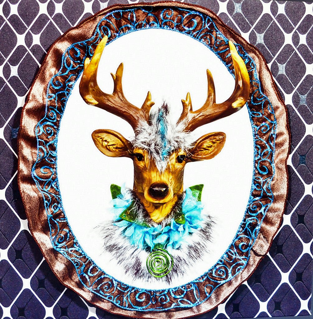 Auch eine Reihe von Drucken hat die Künstlerin mitgebracht. Alle zeigen Hirschköpfe mit starken menschlichen Zügen. Die Originale sind aus Polyresin, mit Tapeten, Stoff, Federn, Schmuck veredelt. „Sie hatte immer schon einen leichten Hang zu Kitsch“, lachte ihr Mann. Er ist Mitinhaber einer Druckerei und hat von den Originalen Fine-Art-Prints geschaffen.