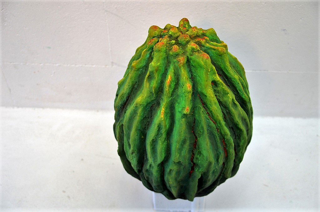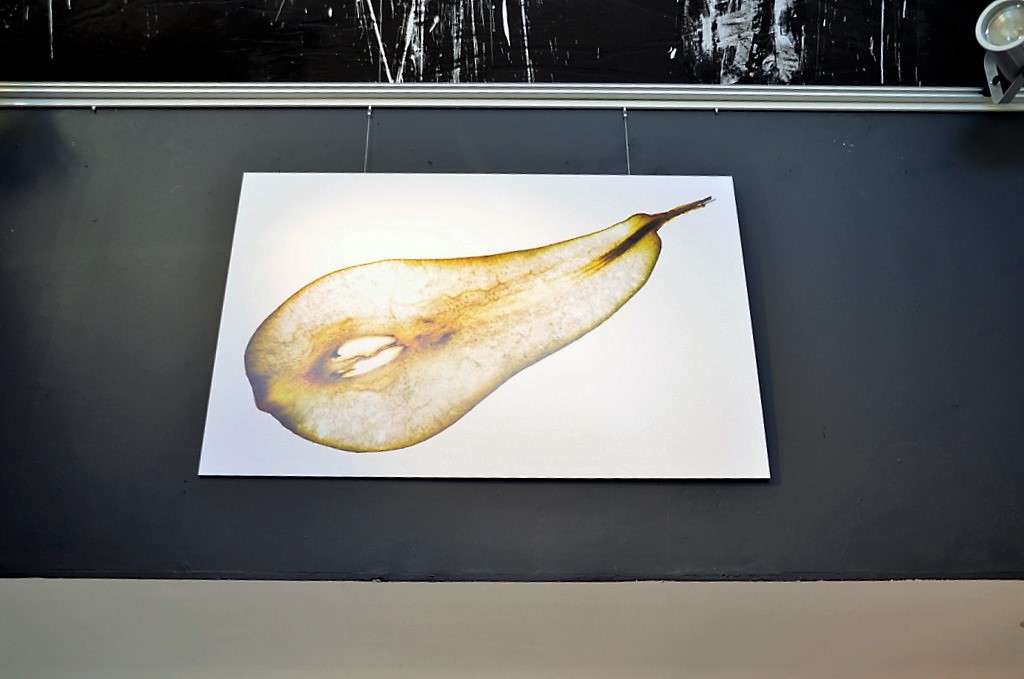 In der Ausstellung hängen zahlreiche Früchte, die das Innere zeigen. Auf weißem Untergrund lenkt nichts vom eigentlichen Motiv ab, wird jedes Objekt gekonnt in Szene gesetzt, ob es sich nun um Blüten, Obst oder Gemüse handelt. Die Arbeiten sind kaschiert, das heißt, auf Papier gedruckt und anschließend auf eine Aluplatte aufgezogen.