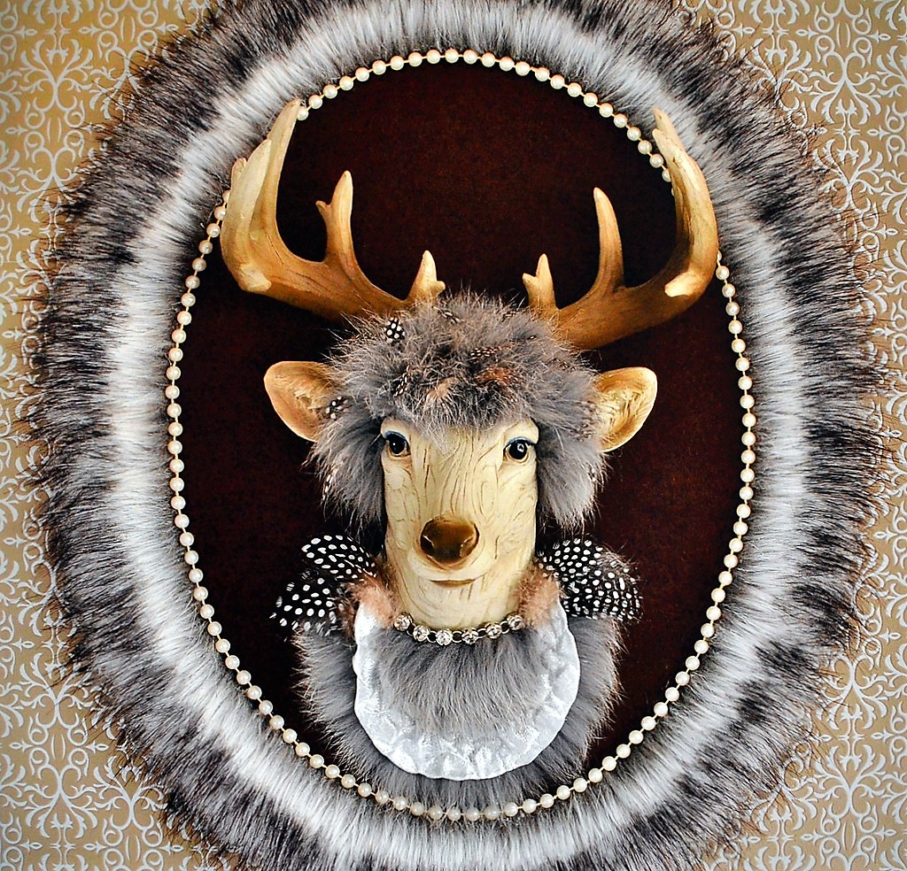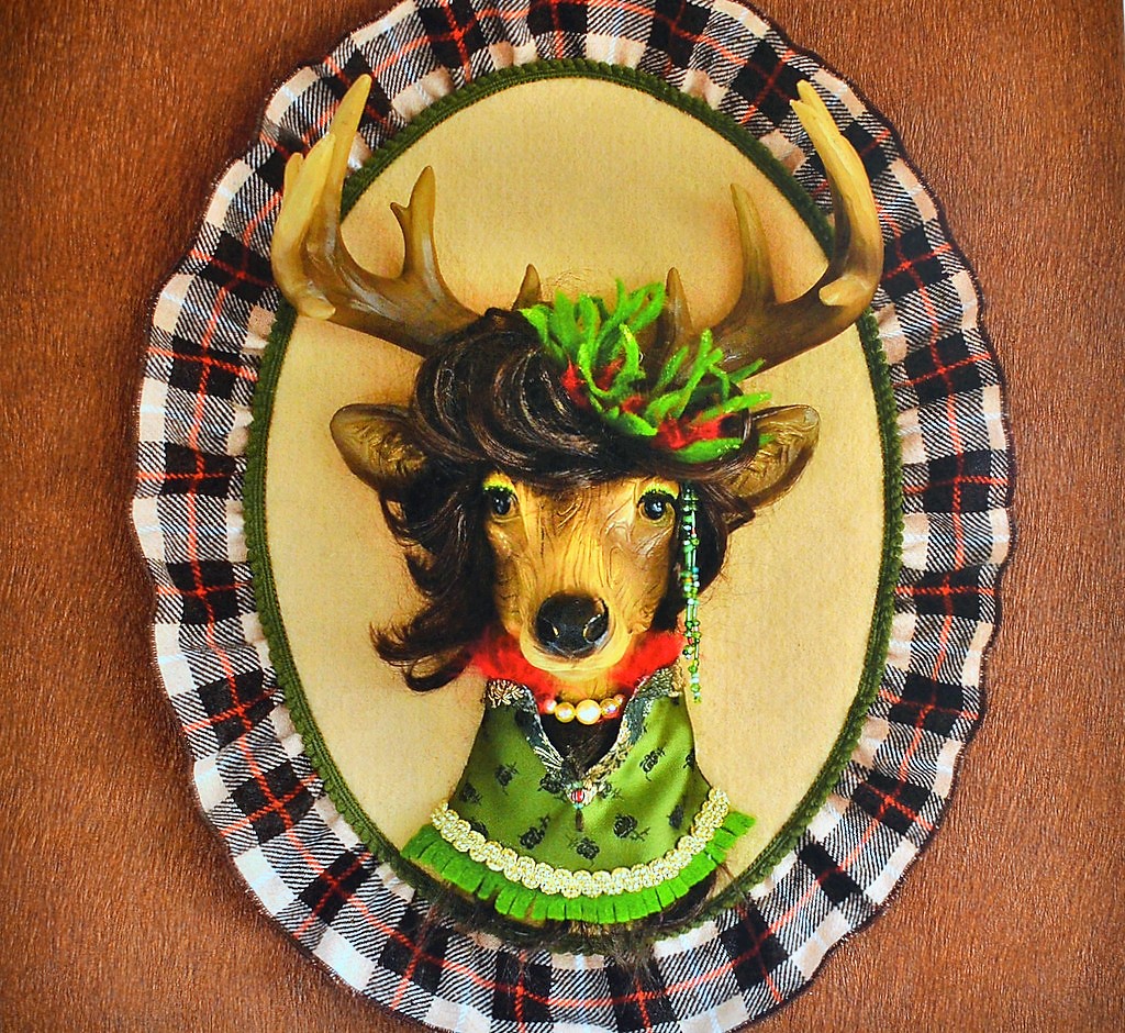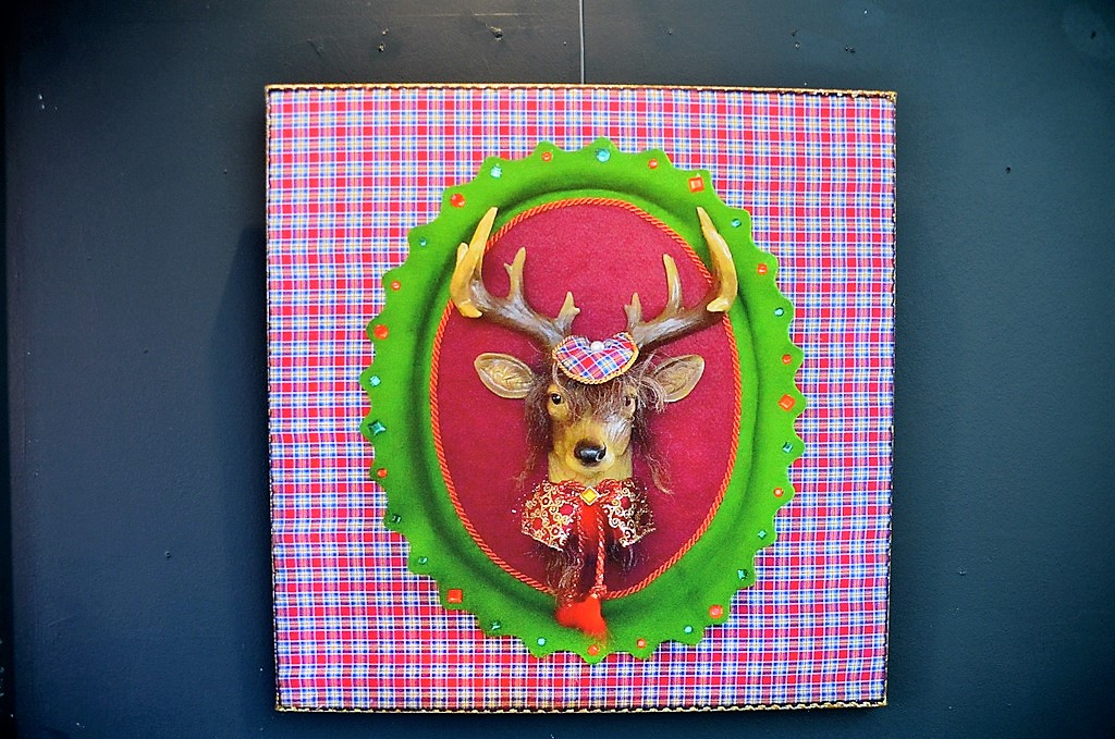 Auch eine Reihe von Drucken hat die Künstlerin mitgebracht. Alle zeigen Hirschköpfe mit starken menschlichen Zügen. Die Originale sind aus Polyresin, mit Tapeten, Stoff, Federn, Schmuck veredelt. „Sie hatte immer schon einen leichten Hang zu Kitsch“, lachte ihr Mann. Er ist Mitinhaber einer Druckerei und hat von den Originalen Fine-Art-Prints geschaffen.