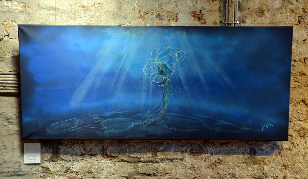 JuliEtta präsentiert dem Besucher – so scheint es zunächst – eine große Qualle, die sich bei näherer Betrachtung als Plastiktüte entpuppt. Damit will die Künstlerin darauf aufmerksam machen, dass nicht das Verlassen einen Ort zum „Lost Place“ macht, sondern Gedankenlosigkeit und Unachtsamkeit. Das großformatige Werk von Peter Wischnewski zeigt zunächst den Blick auf eine idyllische Szene: Fachwerkhaus im Grünen. Bei näherer Betrachtung erschließt sich dem Beobachter dann aber, was sich tatsächlich unterhalb dieser Szene abspielt und in Wahrheit das Terrain zum „Lost Place“ werden lässt.