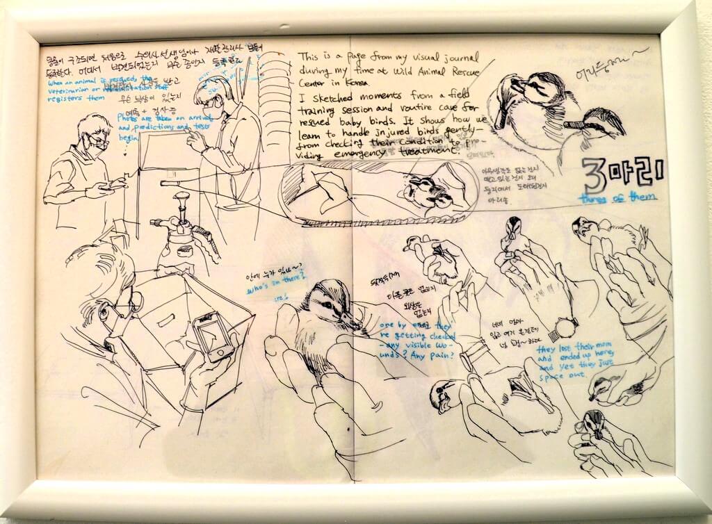 Sojeong Park, 1994 in Seoul geboren und in Korea wie Düsseldorf aktiv, liebt die feinsinnige Verbindung von Zeichnung, traditioneller koreanischer Pigmentkunst und natürlichen Materialien wie Holz oder Glas. Im Zentrum ihres Schaffens finden sich die unsichtbaren und oft übersehenen Tiere der Stadt, insbesondere Vögel.