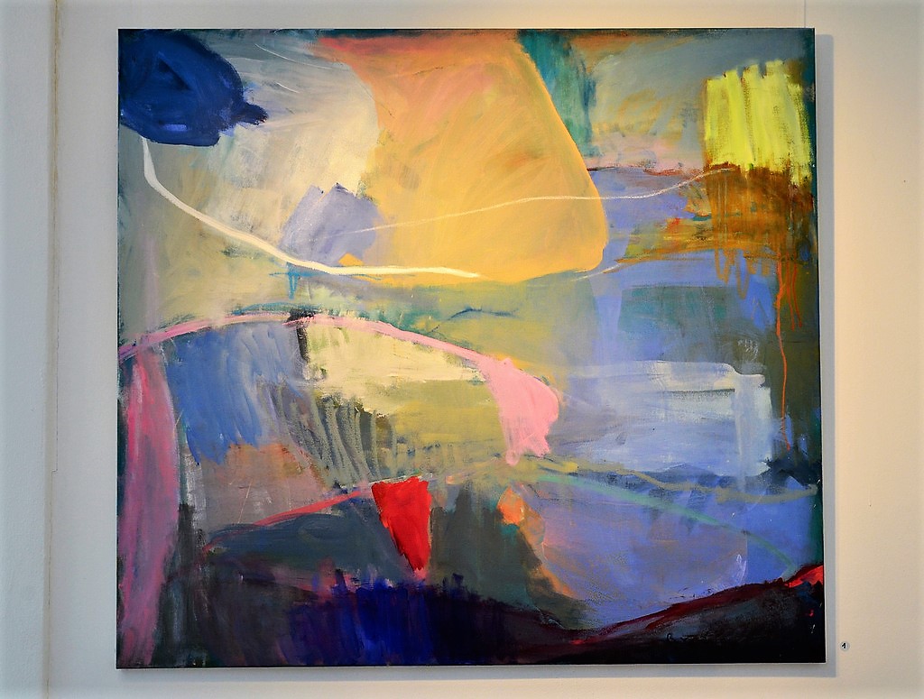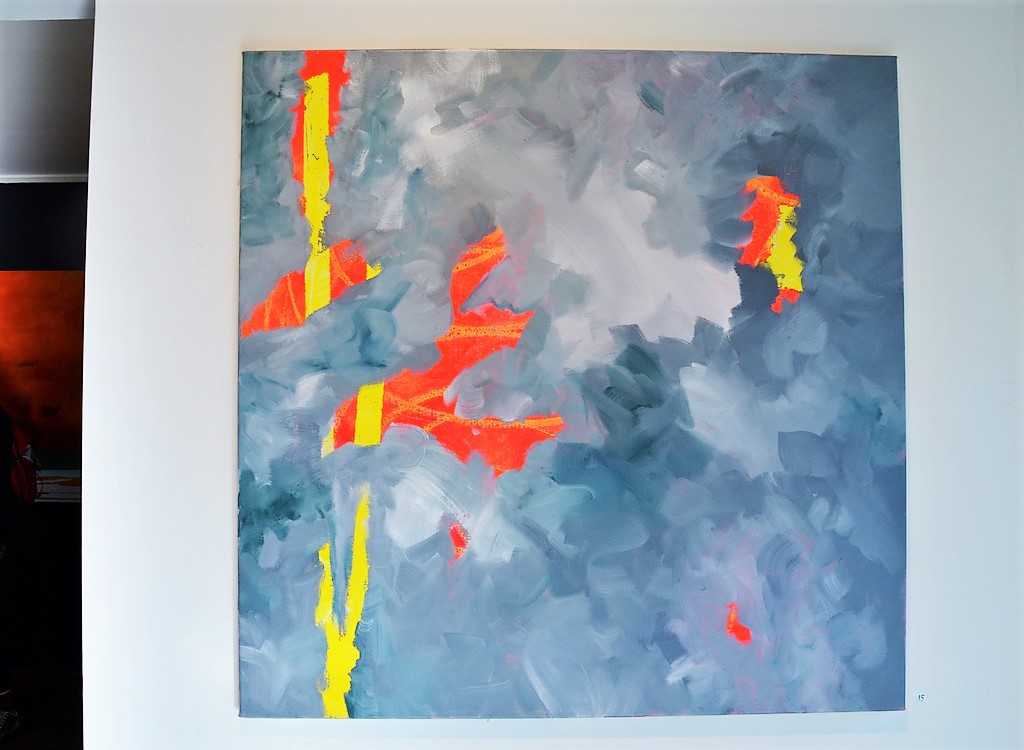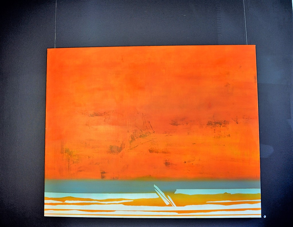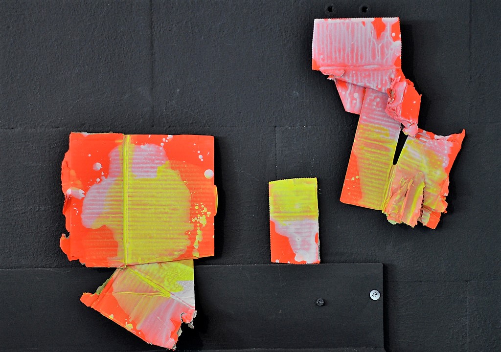 Gleich neben ihrem in kraftvollem Rot und Orange strahlenden Werk hängt eine Anzahl kleinerer, leuchtend bunter Bruchstücke, die beinahe wie Teile eines Puzzles anmuten. Der Entstehungsprozess aus Farbe auf Karton hat faszinierende Ergebnisse vorgebracht. Isabel Kämpf setzt sich mit Material und Dynamik auseinander, experimentiert und schaut, was passiert. Es zulassen und sich darauf einlassen – darum geht es. Isabel Kämpf hat ebenso wie Heidi Becker an der fadbk in Essen studiert und war ebenfalls Meisterschülerin. Der überwiegende Teil ihrer Arbeiten ist in Acryl und Lack auf Leinwand entstanden. Darüber hinaus hat die Essener Künstlerin aus bräunlichen Holzfurnierstreifen und Lack eine Skulptur geschaffen, die reichlich Möglichkeiten zur Interpretation gibt. Auch Isabel Kämpf hat ihre Arbeiten nicht betitelt. So wird dem Betrachter nichts vorgegeben und er kann seiner Fantasie freien Lauf lassen.