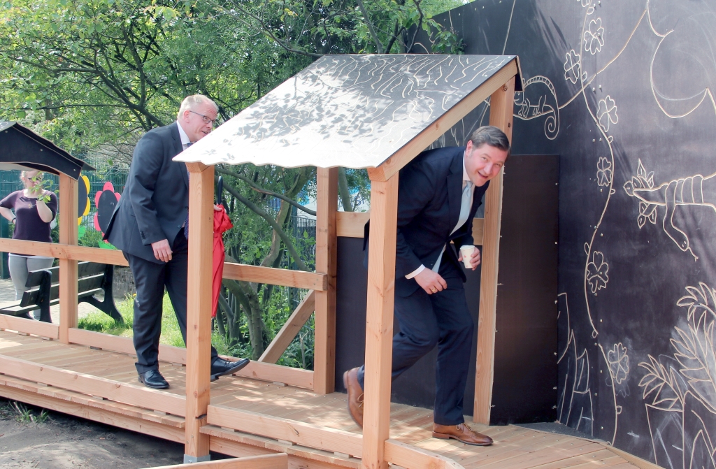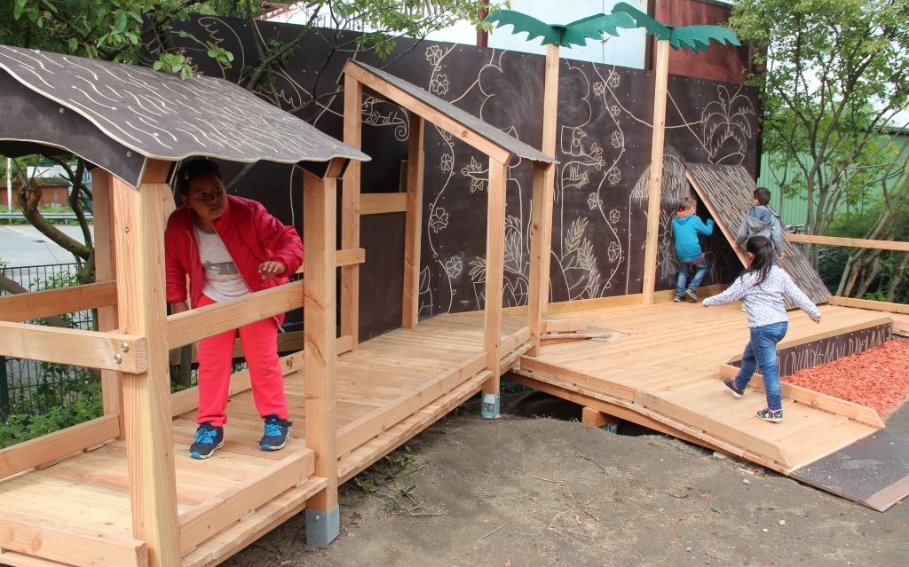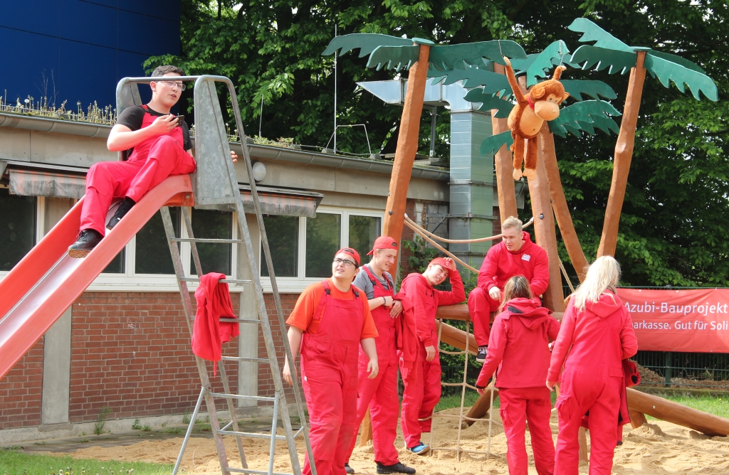Auch in diesem Jahr steuerte die Solinger Baufirma Schermuly den Beton bei. Unterstützt wurde das Projekt außerdem von der Firma ALEA (Anders lernen durch Erfahrung und Abenteuer), die mit mehreren erfahrenen Handwerkern vor Ort waren und die Bank-Azubis anleiteten. „Wir haben unter anderem zwei Sandkästen gebaut sowie eine Wackelbrücke und eine Wippe. Zudem haben wir auch eine Art Dschungeldorf mit Rampen gebaut, damit auch die Kinder im Rollstuhl drauf fahren können“, erzählte Azubi Marcel Meyrahn (20) am Freitag bei der Einweihung. Auch wurden die bestehenden Klettergeräte auf Vordermann gebracht und in den Dschungel-Spielplatz integriert.