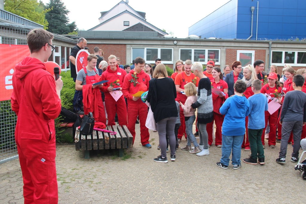 SOLINGEN (bgl) – In ihrem normalen Berufsalltag tragen die 15 Auszubildenden der Solinger Stadt-Sparkasse Anzug oder Kostüm. Und sie machen sich während ihrer Arbeit auch nicht unbedingt die Finger schmutzig. Das war in den vergangenen fünf Tagen grundlegend anders. Zum 11. Mal organisierte die Sparkasse ein Azubi-Bauprojekt. In diesem Jahr gab eine Jury der Wilhem-Hartschen-Schule an der Walder Liebigstraße den Zuschlag. Rund 150 Schülerinnen und Schüler werden dort unterrichtet.