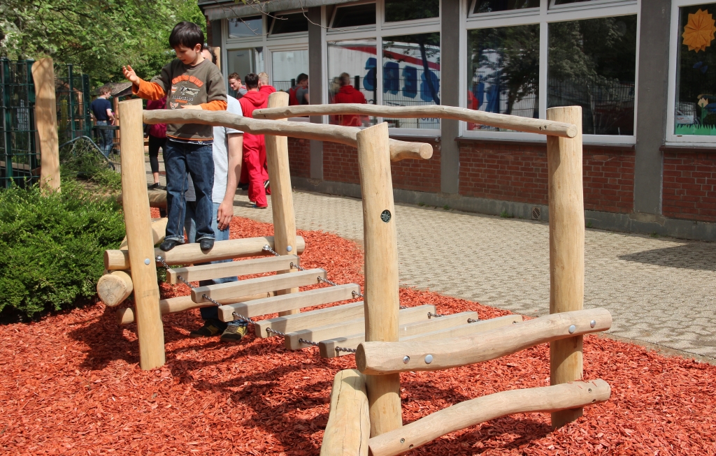 Die Kids der Wilhelm-Hartschen-Schule nahmen die neuen Spielgeräte am Freitag im Sturm. Diese wurden von 15 Azubis der Stadt-Sparkasse in dieser Woche gebaut. (Foto: © B. Glumm)