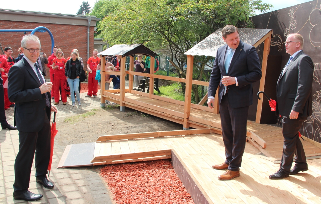 Der Moment der Wahrheit: Sparkassen-Vorstandsvorsitzender Stefan Grunwald (li), Oberbürgermeister Tim Kurzbach und Schulleiterin Ingrid Lebeck durchtrennten das Flatterband und gaben den Spielplatz am Freitag frei. (Foto: © B. Glumm)