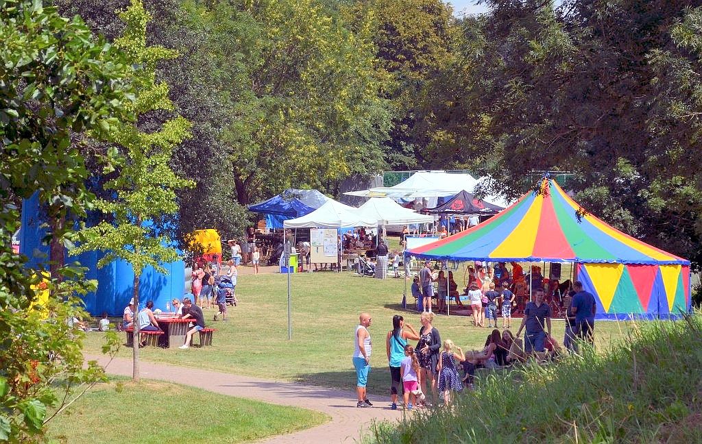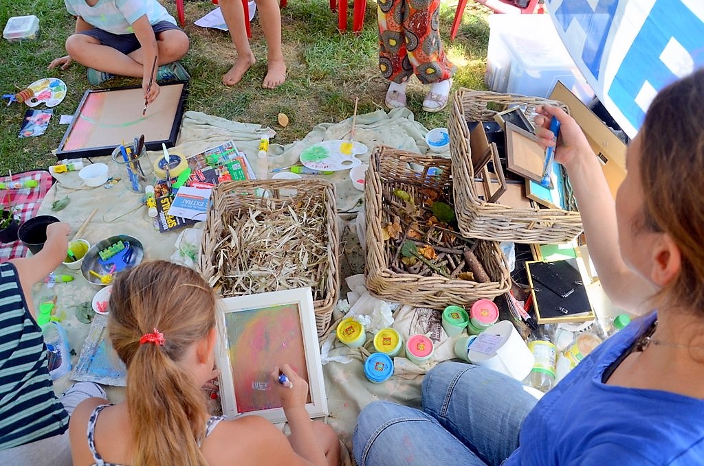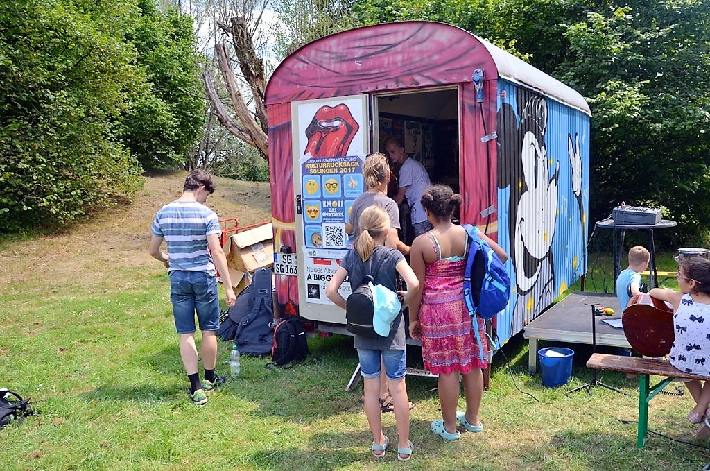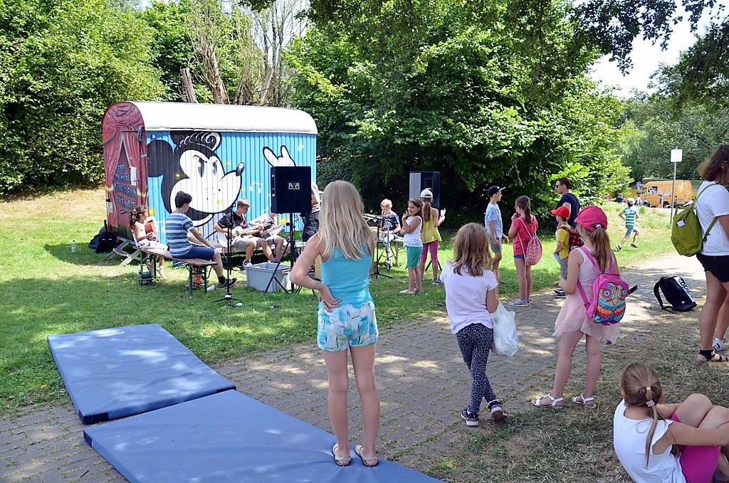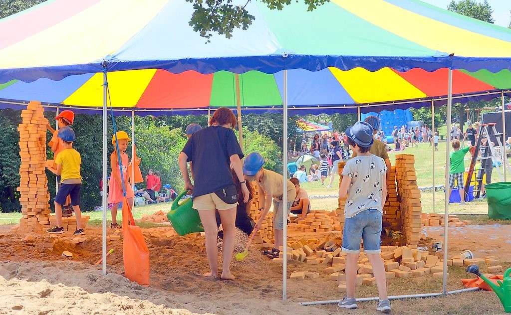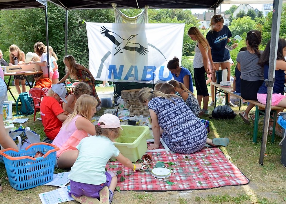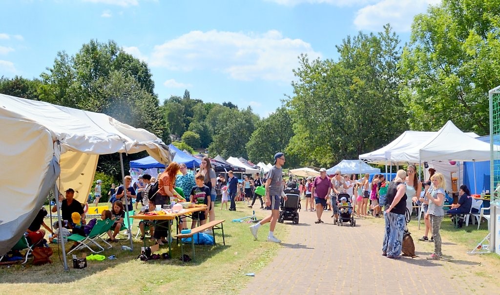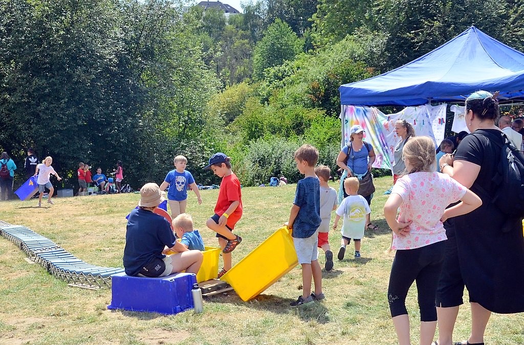 Günther Schmitz vom Jugendhaus Friedenstraße hat bei seiner Veränder-Bär jede Menge Vorschläge bekommen. Die Beteiligungsmaterialkiste, eigentlich Veränder-Bar, dient dazu, mit Kindern in einen Dialog zu kommen, um Anregungen und Vorschläge zu sammeln und Rückmeldungen zu erhalten. „Da kommen richtig viele und gute Ideen.“ Ebenfalls beim Spielezirkus, Manga-Workshop, Fußball-Court und Kanufahren ist eine enorm hohe Nachfrage. Kreative Angebote wechseln mit kleinen Chill-Areas ab. Viele Familien haben Picknickdecken mitgebracht und machen es sich auf der Wiese gemütlich.