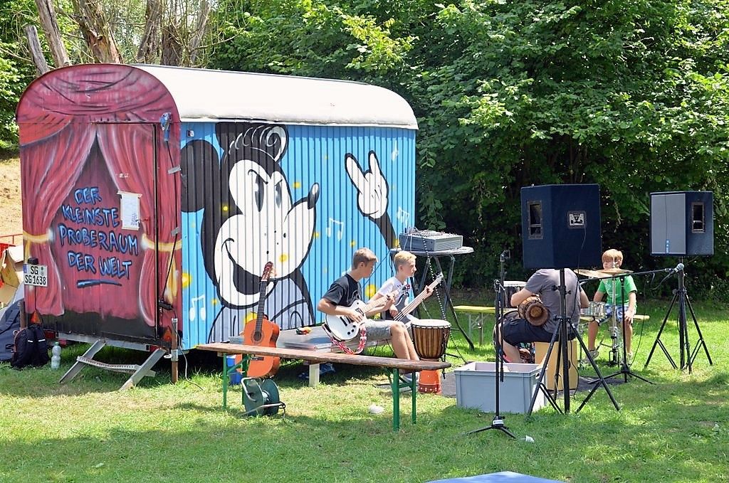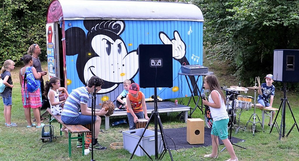 Im kleinsten Proberaumhaus werden neue Stars geboren. Leiter Jörn Quade hat zahlreiche Instrumente aufgebaut. Da warten Schlagzeug, Bass und E-Gitarre neben Trommeln, Bongos und Cajon auf musikalische Proben. Im Inneren des Wagens geben die kleinen Sängerinnen und Sänger eine Kostprobe ihres Könnens. Begleitung erfolgt am Keyboard. Quade hat für interkulturellen Musikunterricht eine Weltkarte der Musik entwickelt. Auf der Karte findet man rund 1.900 Musikstile, Rhythmen, Gesänge, Instrumente und Tänze, jeweils geografisch entsprechend platziert.