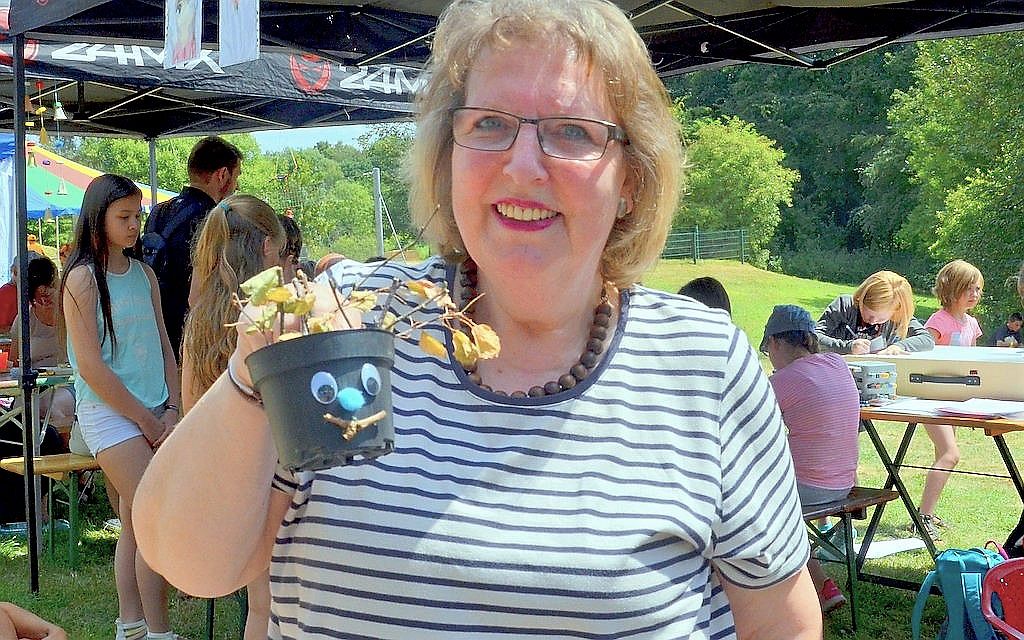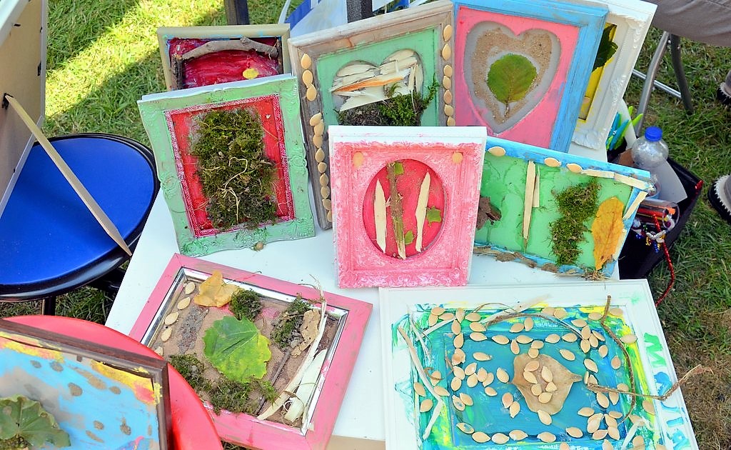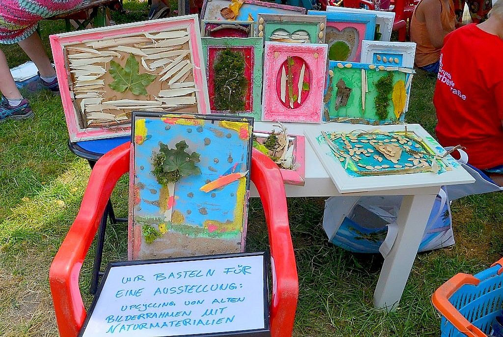 Auch Edeltraut Krüger vom NABU ist begeistert: „Alle sind unermüdlich beim Basteln. Wir machen hier kleine Waldmonster aus verschiedenen Naturmaterialien.“ In den Händen der Kinder verwandeln sich Zweige und Blätter in lachende Waldmonster mit Wackelaugen. NABU-Mitglied Bettina Siller fertigt gemeinsam mit den Bastelkünstlern aus alten gesponserten Bilderrahmen, die mit Material aus dem Wald dekoriert werden, bezaubernde Bilder. Die Werke sollen kurzfristig in einer Ausstellung gezeigt werden.