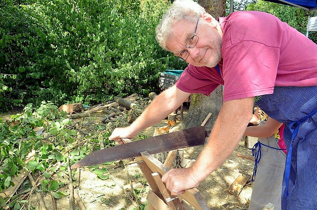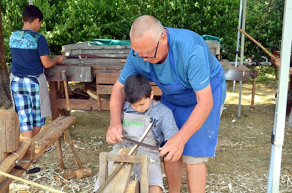 Helmar Wolf und Martin Friedrich vom Grünspechtmobil helfen den kleinen Holzarbeitern bei der Herstellung von Flitzebögen, Werkstücken, Blumenhockern und mehr. Wolf ist Arbeitspädagoge und Fachagrarwirt der Baumpflege und verfügt über reichlich Erfahrung mit Grünholzangeboten und Waldexkursionen. Friedrich ist Dipl.-Sozialpädagoge im „Un-Ruhestand“. Bei der Herstellung der Kunstwerke aus weichem Holz wird mit echten historischen Werkzeugen gearbeitet.