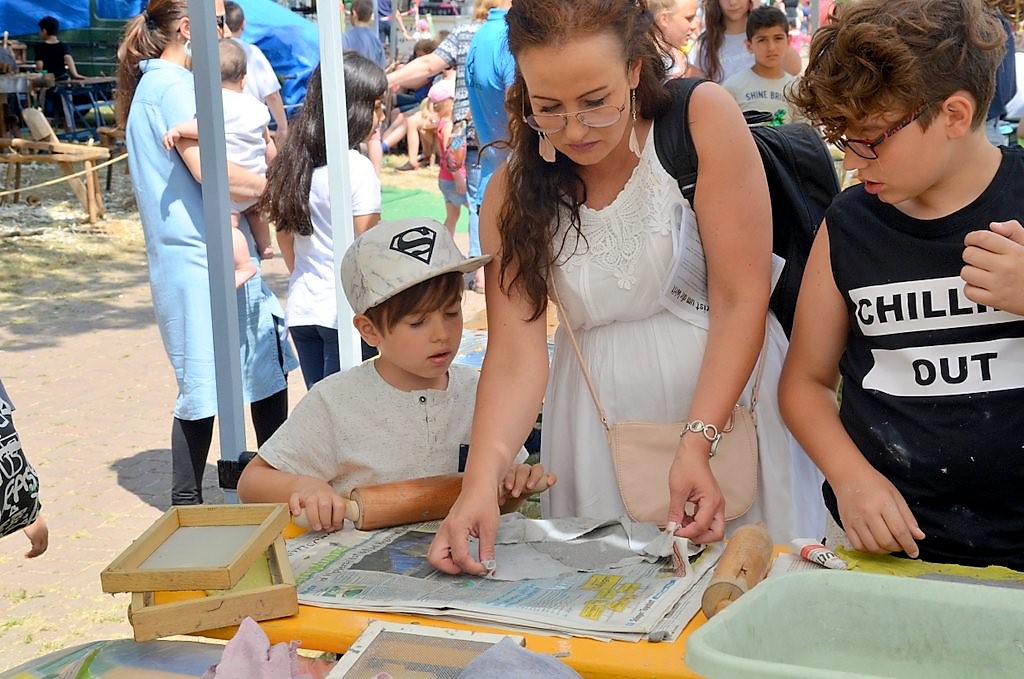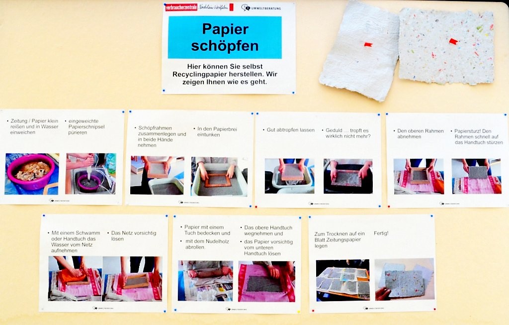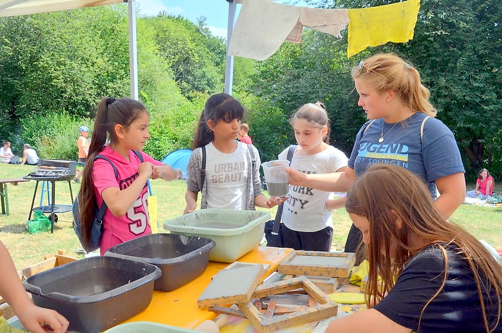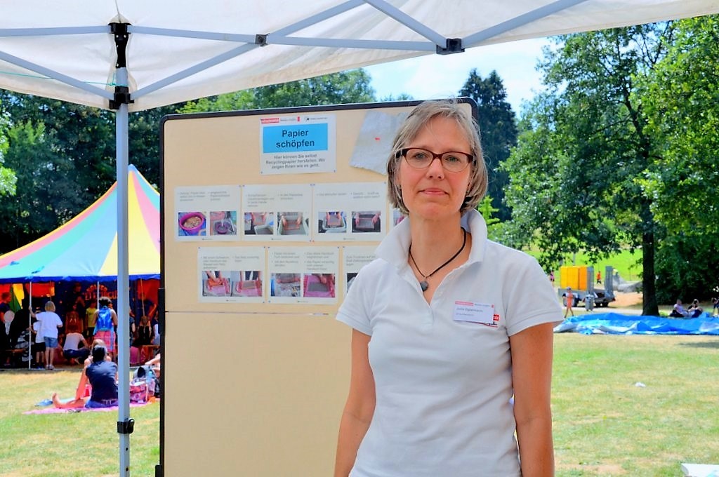 Am Stand der Verbraucherzentrale kann man selbst Papier schöpfen. Julia Ogiermann von der Verbraucherzentrale NRW freut sich über das große Interesse. „Wir machen aus alten Zeitungen neue Blätter. Erst reißt man Papier in kleine Schnipsel und püriert es mit Wasser zu einem Brei. Dann wird mit dem Schöpfrahmen Papier geschöpft. Nachdem das Wasser herausgepresst wurde, kommt das Papier zum Trocknen auf die Wiese.“ Als Stempel für die erfolgreiche Teilnahme verteilt Ogiermann den blauen Umweltengel. Der Andrang ist riesengroß. Bis zum Mittag haben etwa 80 Kinder das Schöpfen ausprobiert.