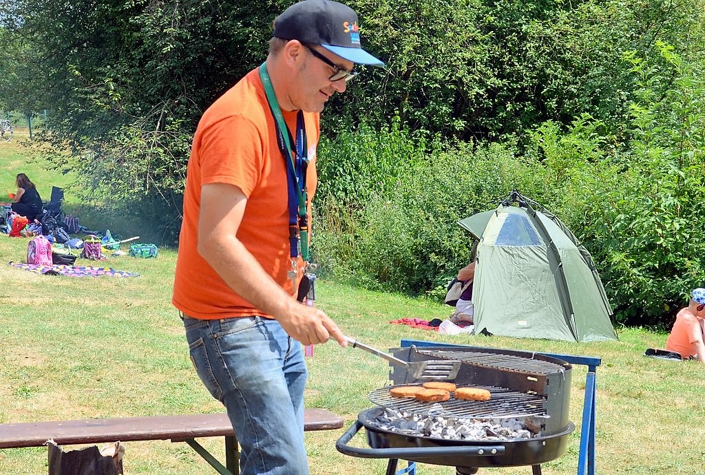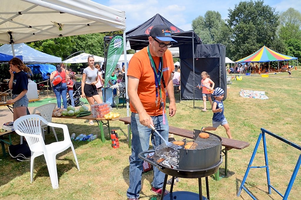 Jens Stuhldreier vom Spielmobil ist als Hans Dampf in allen Gassen unterwegs. „Ich bin heute als Springer im Amt“, lacht er und verliert trotz Hitze und viel Arbeit nicht seine gute Laune. Mal übernimmt er die Pausenvertretung, dann steht er am Grill und brät Burger. Sinja und Michelle geht es ähnlich. Trotzdem sind sie sich einig: „So groß war die Bärenwoche noch nie. Wir sind total happy, wie gut die Angebote angenommen werden. Einfach bärenstark.“ Die Begeisterung ist verständlich. Bereits am Mittag zählen die Organisatoren rund 1.000 Besucher.