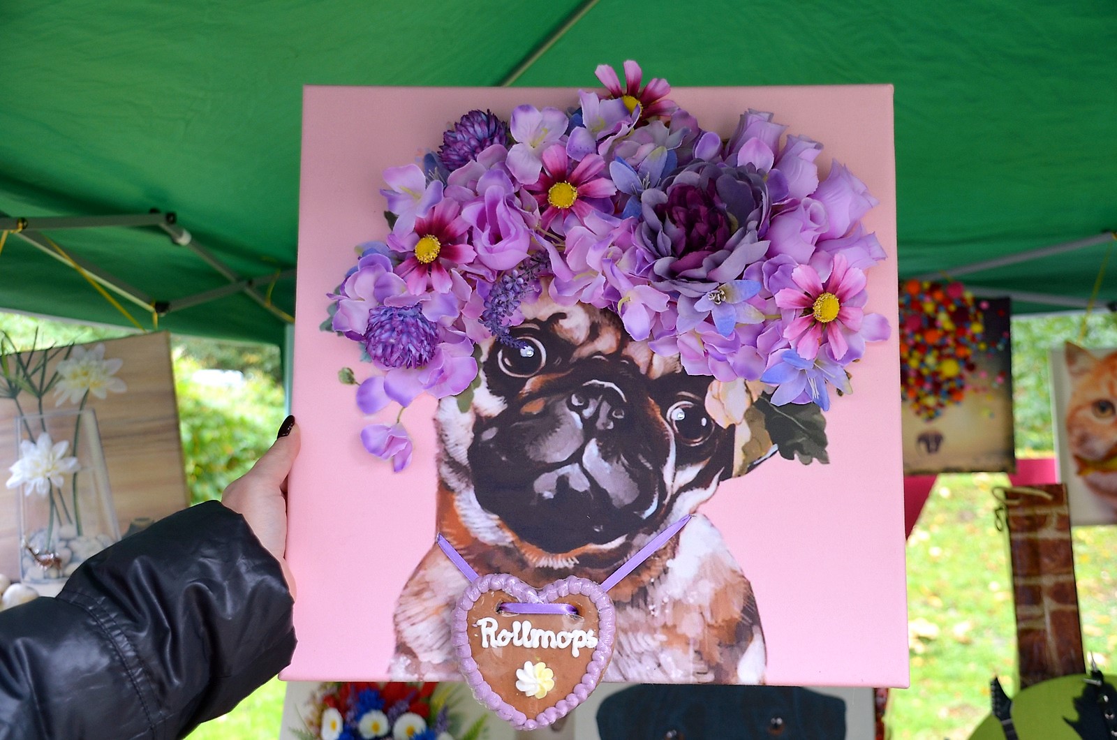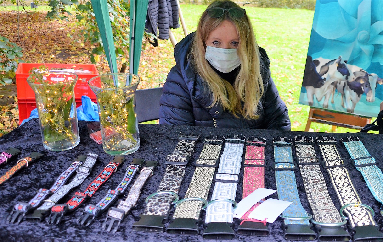An dem kunterbunten Stand von Christiane Kösters zeigten sich Bilder in allen Farben. „Ich mache Upcycling-Bilder aus alten Kissenbezügen, Leinentaschen, T-Shirts“, erklärte die Schauwerbegestalterin. Eigentlich ist sie selbstständige Messedekorateurin, aber wie in vielen anderen Bereichen liegt auch hier derzeit alles brach. So nutzte sie die Zeit für ihre Stoffbilder, die sie mit Upcycling-Material wie Fahrradschläuchen, Speichen, Abdeckhauben und anderem kreativ und fantasievoll dreidimensional aufpeppte. Hunde, Katzen und Kühe trugen große Kopfbedeckungen aus Seidenblüten und Strass-Steinchen in den Augen. „Das sieht aus, als ob sie einem zuzwinkern“, lachte die Künstlerin.