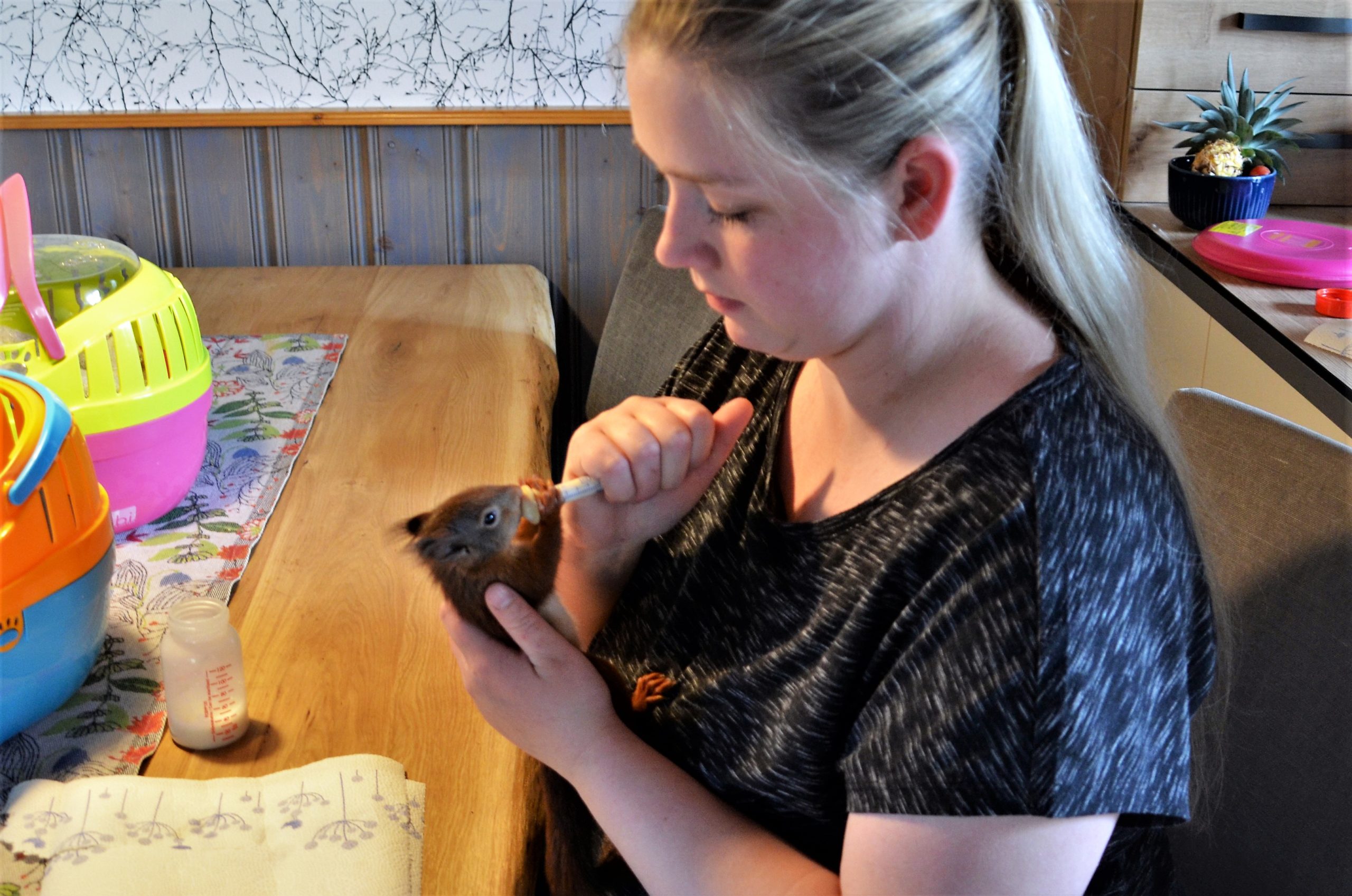SOLINGEN (mh) – Lutz und Elsa sind immer hungrig. Die beiden Eichhörnchen werden derzeit von Wildpäpplerin Lena Sonnenschein gepflegt. Im vergangenen Jahr hatte sie insgesamt 76 Tiere in Pflege (wir berichteten). Seit März dieses Jahres sind schon 30 der possierlichen Tiere bei der Hörnchen-Ersatzmutter gelandet. „Als Elsa gefunden wurde, war sie noch nackt und so unterkühlt, dass ich nicht sicher war, ob sie überleben würde.“ Doch Elsa hat es geschafft. Auch Lutz, der einen tiefen Biss im Bein davongetragen hatte, ist wieder auf dem Damm. Die kleine Hazel kam als drei Wochen altes Jungtier mit einer schweren Armverletzung ins Haus. In solchen Fällen wendet die Tierfreundin mit großem Erfolg Manuka-Honigsalbe an.