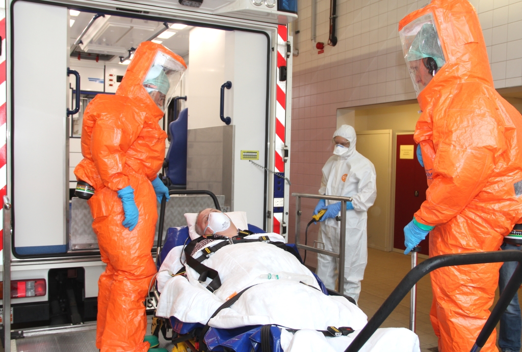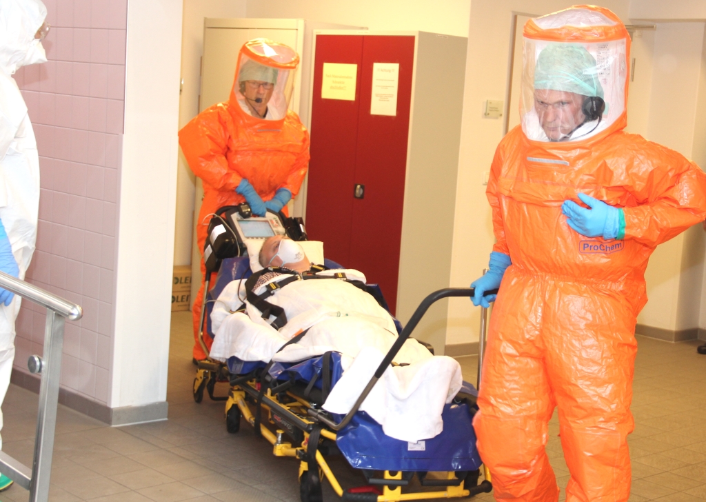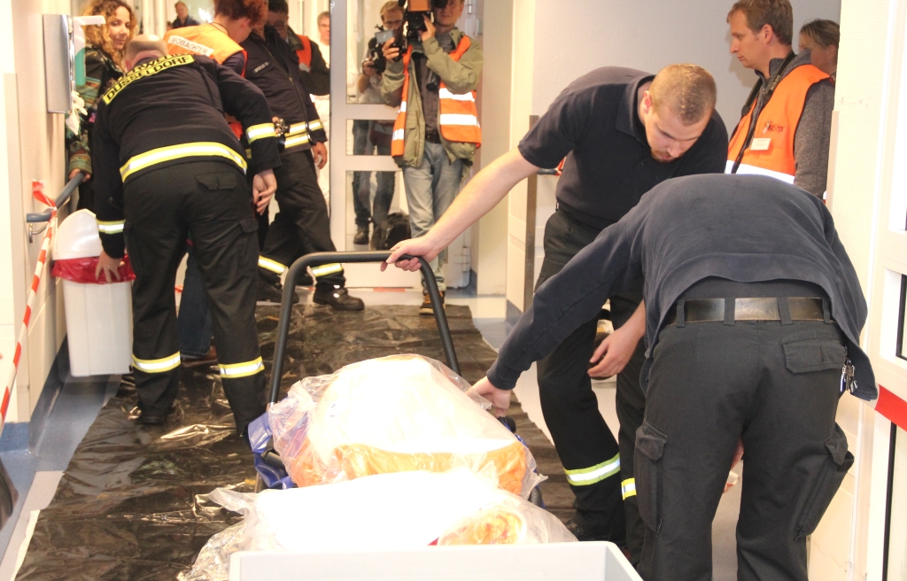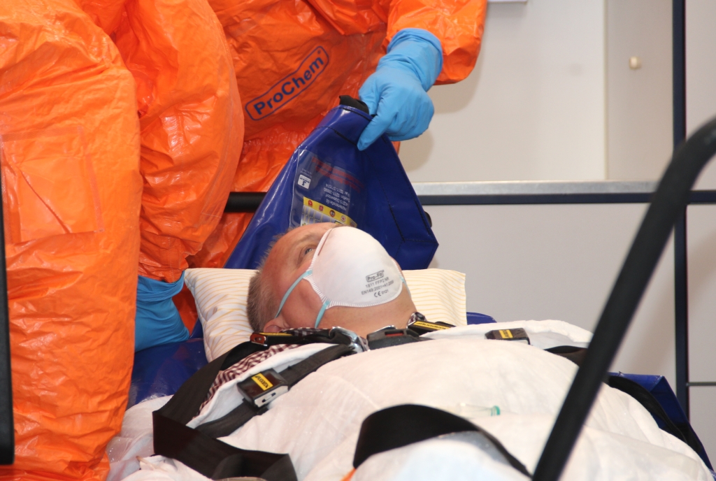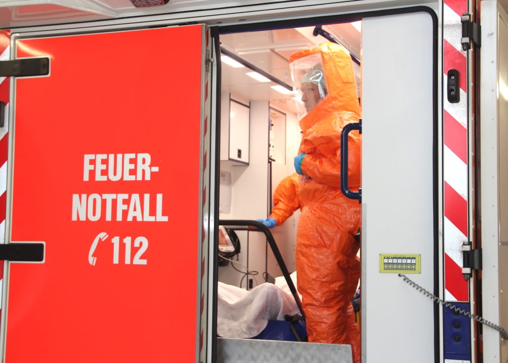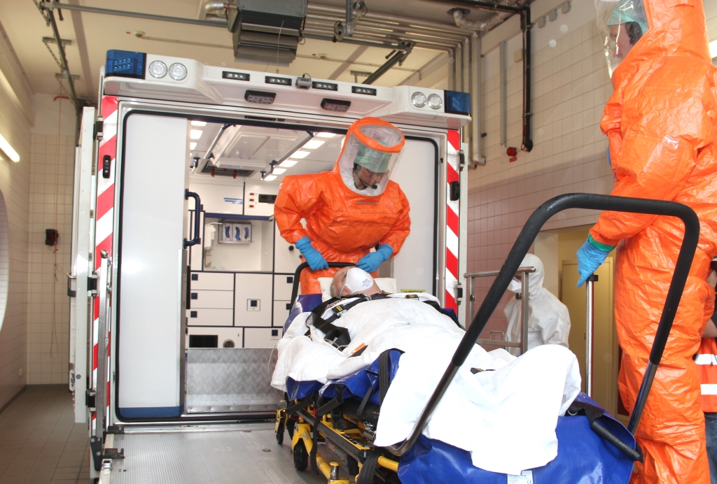 Nach rund einer Stunde wurde der Patient, dargestellt von Herbert Wiets von der Berufsfeuerwehr Solingen, schließlich auf einer Trage für schwere Lasten fixiert und von Beamten in Schutzanzügen in den speziellen Düsseldorfer Rettungswagen gebracht. Die Fahrt mit dem Hochinfektionstransport ging weiter in die Düsseldorfer Uni-Klinik, die über eine Sonderisolierstation mit insgesamt drei Betten verfügt. Derartige Spezialstationen gibt es in ganz Deutschland lediglich fünf.