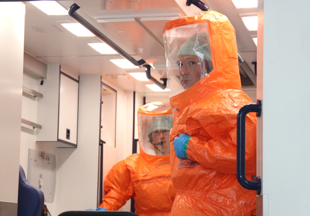 Währenddessen wurde die Berufsfeuerwehr in Düsseldorf alarmiert, die jederzeit auf einen Hochinfektionstransport vorbereitet ist und einen speziellen Rettungswagen für derartige Einsätze vorhält. Eine Wagenkolonne mit mehreren Fahrzeugen und zahlreichem Personal machte sich von der Landeshauptstadt auf den Weg nach Aufderhöhe. Angekommen in der Liegendanfahrt von Bethanien, wurde umgehend der Weg von der Notaufnahme zum Patientenzimmer erkundet und für den Transport vorbereitet.