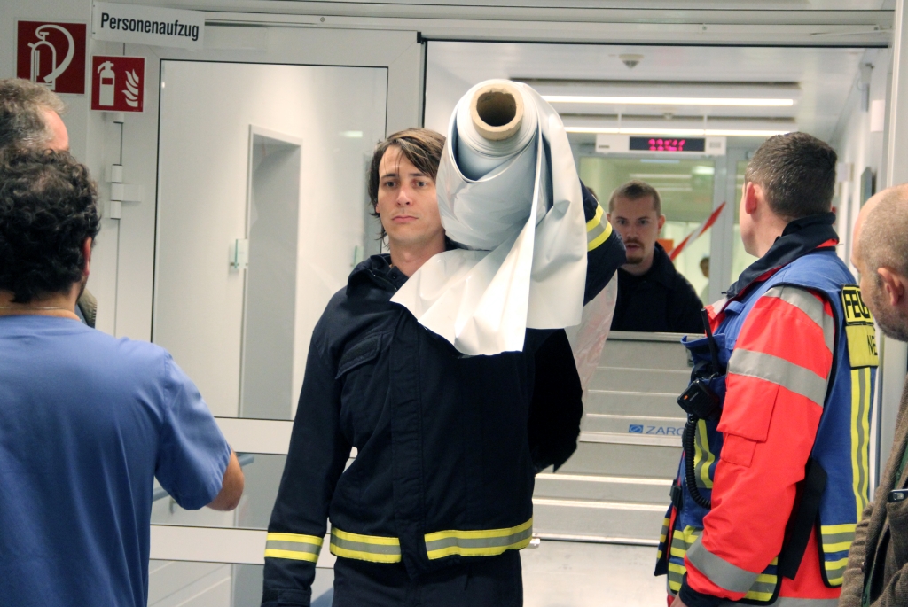 Der gesamte Weg wurde komplett abgesperrt und für Patienten, Besucher und auch medizinisches Personal, das nicht mit dem Transport betraut war, unzugänglich gemacht. Gleichzeitig legten die Beamten der Düsseldorfer Berufsfeuerwehr Schutzanzüge an, legten den Gang der Station 1 in Bethanien mit Folien aus und desinfizierten gleichzeitig die Treppen.