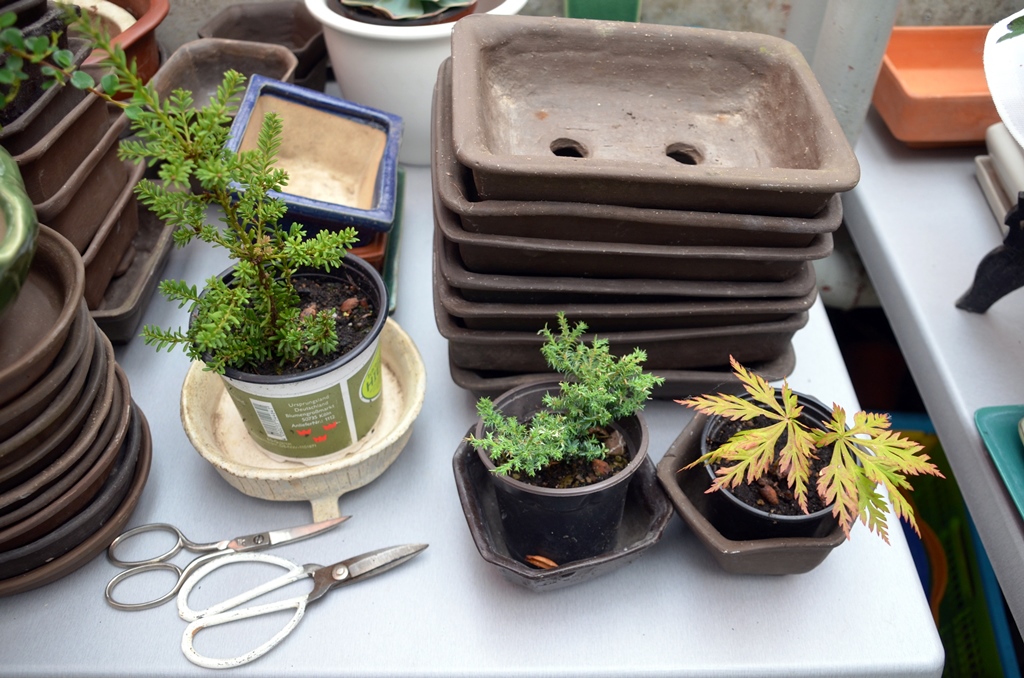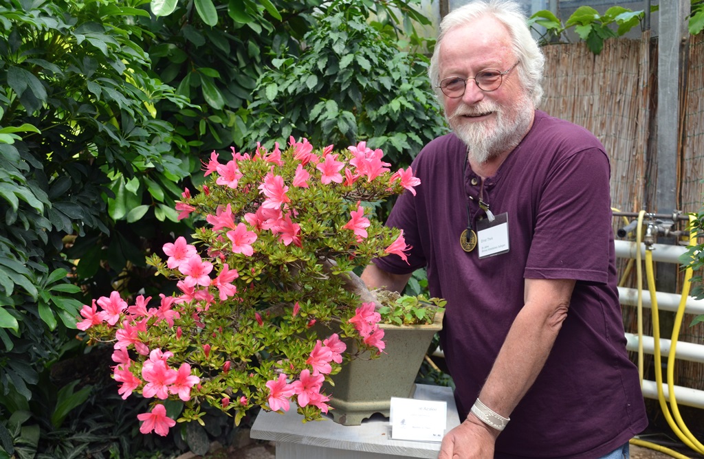 Doch auch aus vielen anderen Arten kann man einen Bonsai gestalten. „Bonsai heißt ja nichts anderes als Baum in Schale“, erklärt Ernst Theis. „Es ist ein gestalteter Baum.“ Da sich die Wurzeln in der Schale nicht ausdehnen können, bleiben die Blätter klein. Früchte und Blüten entwickeln sich dagegen in der Originalgröße. Neben den vielen Ahornarten finden Besucher Schlehen, chinesische Ulmen und europäische Lärchen. Voller Stolz zeigt Theis auf ein blühendes Exemplar. „Die habe ich mir letztes Jahr selbst geschenkt“, strahlt er. Die Satsuki-Azalee leuchtet in üppiger Blütenpracht.