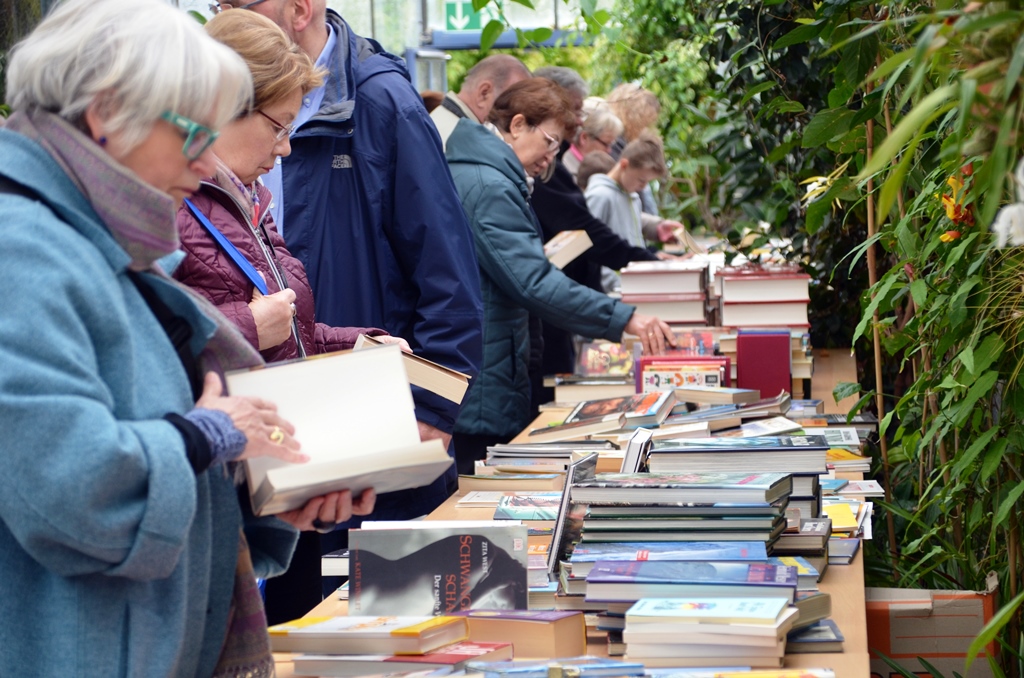 SOLINGEN (mh) – Die fünfte Bücherbörse ist ein Eldorado für alle Leseratten. In der Orchideenhalle des Botanischen Gartens liegen erwartungsvoll mehrere tausend Bücher und hoffen darauf, mitgenommen zu werden. Lange vor 14 Uhr warten die Bücherfreunde schon vor der Tür.