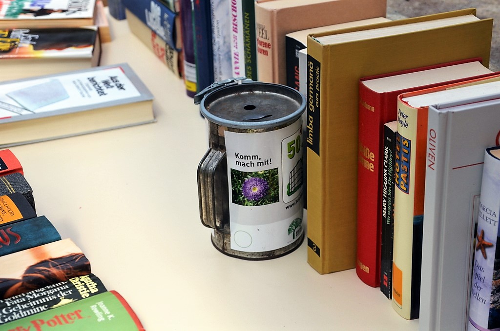 Die Bücherbörse ist ein wunderbares Beispiel für Nachhaltigkeit. Bücher mit anderen auszutauschen statt zu entsorgen, wirkt der Papierverschwendung entgegen und macht außerdem Spaß. Die Bücher werden kostenfrei abgegeben. Doch jede finanzielle Unterstützung kommt der Anlage zugute. Deshalb standen auch diesmal auf den Büchertischen Spendendosen bereit.
