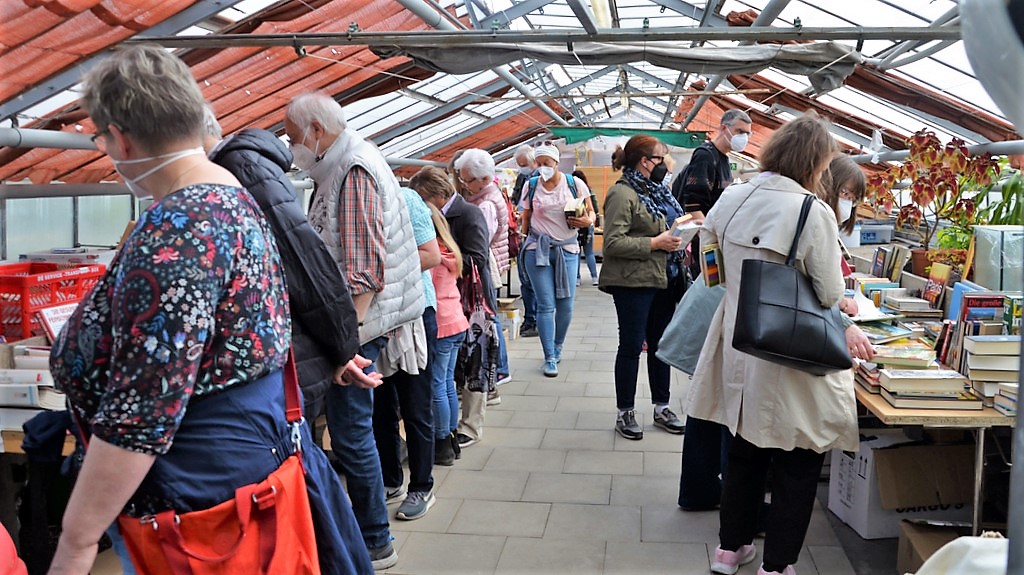 SOLINGEN (mh) – Nach einer zweijährigen Corona-Pause hatte sich am Sonntag der Botanische Garten wieder in einen Ort der Literatur verwandelt. Lange vor 14 Uhr standen die Lesehungrigen mit Taschen vor der Tür und warteten darauf, sich mit neuem Lesestoff versorgen zu können. Was vor Jahren als einmalige Aktion geplant war, hat sich mittlerweile zum Selbstläufer entwickelt. In diesem Jahr zeigte sich die Bücherbörse wieder als großartiger Besuchermagnet.