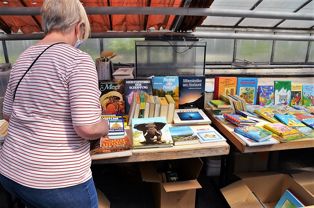 „Wir haben wieder eine bunte Mischung aus Romanen, Krimis, Sachbüchern, Tier- und Kochbüchern auf den Tischen“, meinte Stiftungsmitglied Claudia Elsner-Overberg. „Besonders gefragt sind natürlich immer Kinderbücher.“ Davon hatte sie selbst viele beigesteuert. Aufgrund des schönen Wetters wurden auch die Mauern vor den Gewächshäusern reichlich mit Lesematerial bedacht.