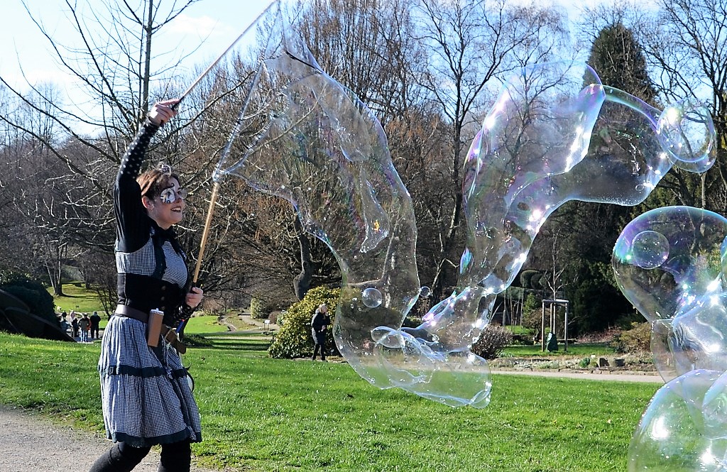 Wer genug gestöbert hatte, konnte sich von Remy Matelots Riesenseifenblasen verzaubern lassen. Die Steampunkerin, die seit einiger Zeit ehrenamtlich im Botanischen Garten tätig ist (wir berichteten), faszinierte kleine und große Besucher nicht nur im Freien mit schillernden Seifenblasen, sondern ließ in der Orchideenhalle Nebelblasen entstehen.