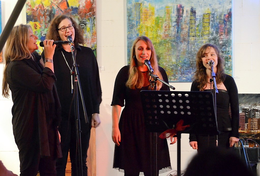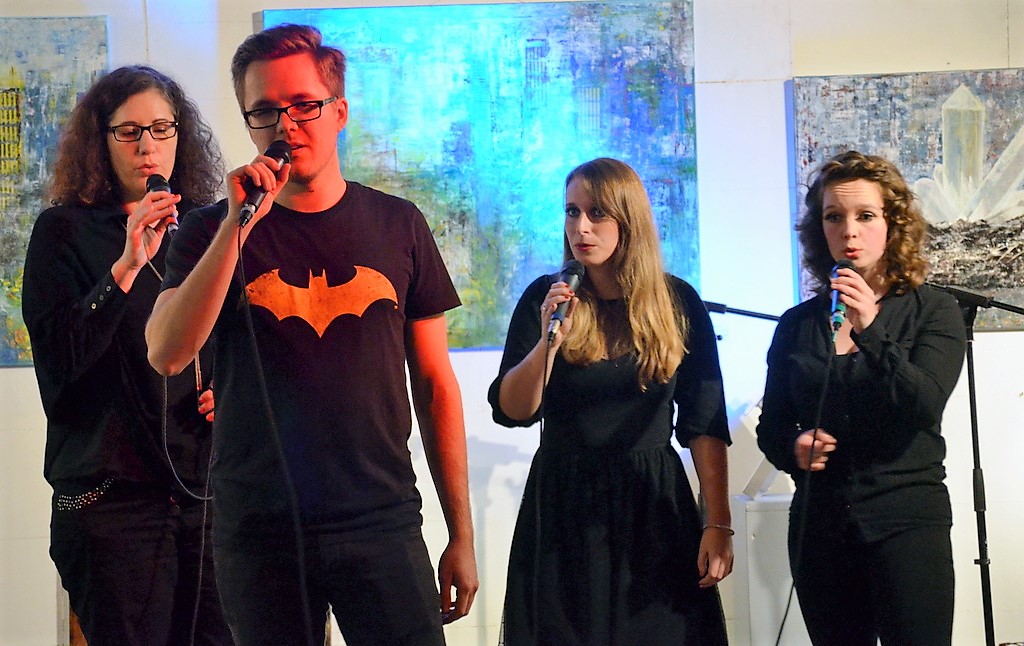 SOLINGEN (mh) – Am Samstagabend gab es im Atelier Pest Projekt bei Peter Amann ein Konzert ohne Instrumente. Die A-cappella-Band ChorFee To Go hatte ein reichhaltiges Repertoire im Gepäck. Sechs Frauen und ein Mann lieferten gecoverte Songs in ganz eigenen, individuellen Arrangements.